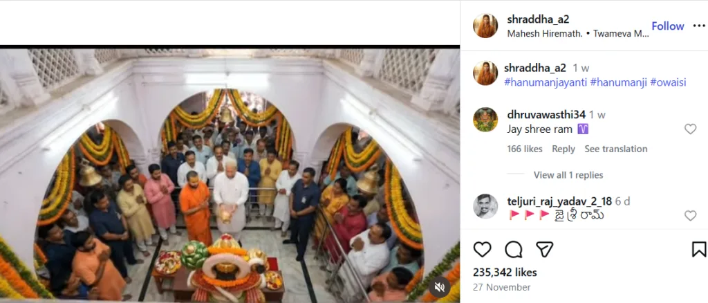 8,244 ഫോളോവേഴ്സ് ഉള്ള ഒരു ഇൻസ്റ്റഗ്രാം അക്കൗണ്ട് വഴി, വീഡിയോ നവംബർ 27 ന് പ്രചരിച്ചിട്ടുണ്ട്. #hanumanjayanti #hanumanji #owaisi എന്നീ ഹാഷ്ടാഗുകൾ പോസ്റ്റിൽ ഉപയോഗിച്ചിരിക്കുന്നു. 2,35,342 ലൈക്കുകൾ ഇതുവരെ ആ പോസ്റ്റിന് ലഭിച്ചിട്ടുണ്ട്.