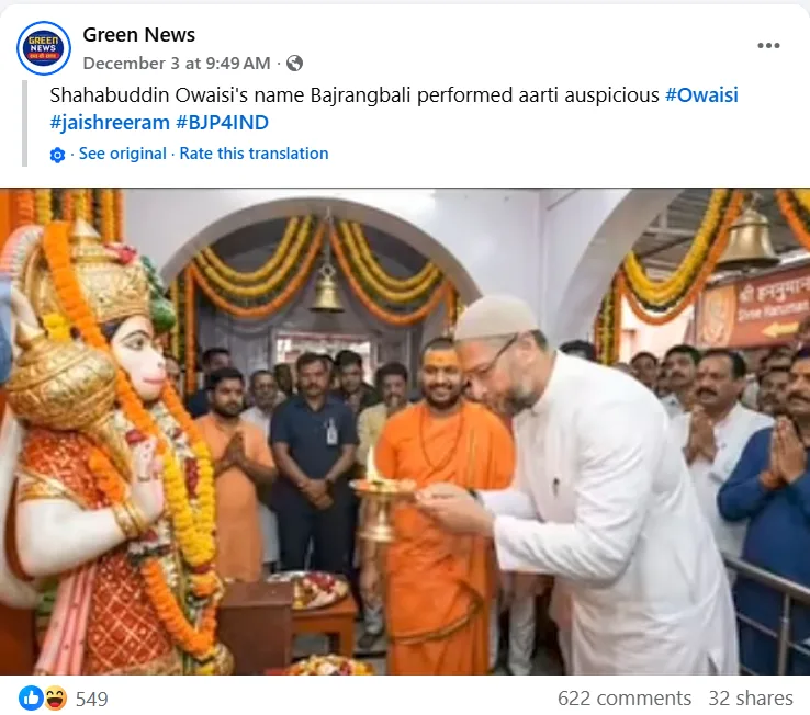 ഒരു ലക്ഷത്തിൽ അധികം ഫോളോവേഴ്സ് ഉള്ള ഗ്രീൻ ന്യൂസ് എന്ന ഫേസ്ബുക്ക് അക്കൗണ്ട് വഴി വീഡിയോ ഡിസംബർ മൂന്നിന് പ്രചരിച്ചിട്ടുണ്ട്. “ബജ്റംഗബലി ആരതി ഒവൈസി മംഗളകരമായി നടത്തി”എന്നാണ് പ്രചരിക്കുന്ന പോസ്റ്റിലെ വിവരണം. 622 പേർ കമൻ്റ് ചെയ്ത പോസ്റ്റിന്, 549 പേരാണ് ലൈക്ക് ചെയ്തത്.