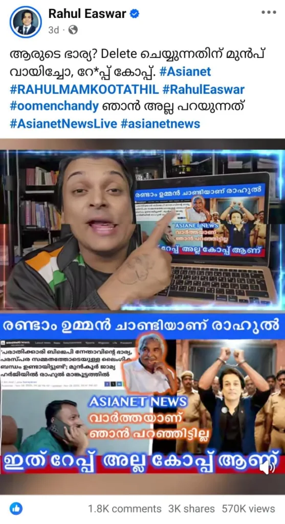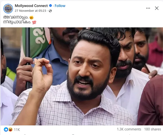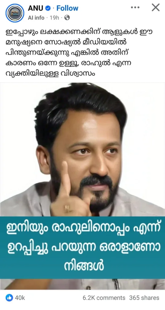 ANU Media എന്ന ഫേസ്ബുക്ക് പേജിൽ, ‘ഇനിയും രാഹുലിനൊപ്പം എന്ന് ഉറപ്പിച്ചു പറയുന്ന ആളാണോ നിങ്ങൾ’ എന്ന പോസ്റ്റിന് നാൽപ്പതിനായിരത്തിൽ അധികം ലൈക്കുകളും 6200 കമന്റുകളുമാണുള്ളത് (നവംബർ 30). ‘ഇപ്പോഴും ലക്ഷക്കണക്കിന് ആളുകൾ ഈ മനുഷ്യനെ സോഷ്യൽ മീഡിയയിൽ പിന്തുണയ്ക്കുന്നു എങ്കിൽ അതിന് കാരണം ഒന്നേ ഉള്ളൂ, രാഹുൽ എന്ന വ്യക്തിയിലുള്ള വിശ്വാസം’ എന്നാണ് പോസ്റ്റിന്റെ അടിക്കുറിപ്പ്. ഒരു ലക്ഷത്തിനടുത്ത് ഫോളോവേർസ് അക്കൗണ്ടാണിത്. ഇതേ ചിത്രം സമാനമായ മറ്റ് ‘നിഷ്പക്ഷ അക്കൗണ്ടുകളി’ലും പതിനായിരമോ അതിലധികമോ ലൈക്കുകളോടെ ‘വൈറൽ’ ആകുന്നതും കാണാം. ഈ പോസ്റ്റുകളുടെ കമന്റ് ബോക്സിലും അതിജീവിതയ്ക്ക് നേരെയുള്ള അധിക്ഷേപ പരാമർശങ്ങൾ അനവധിയാണ്.