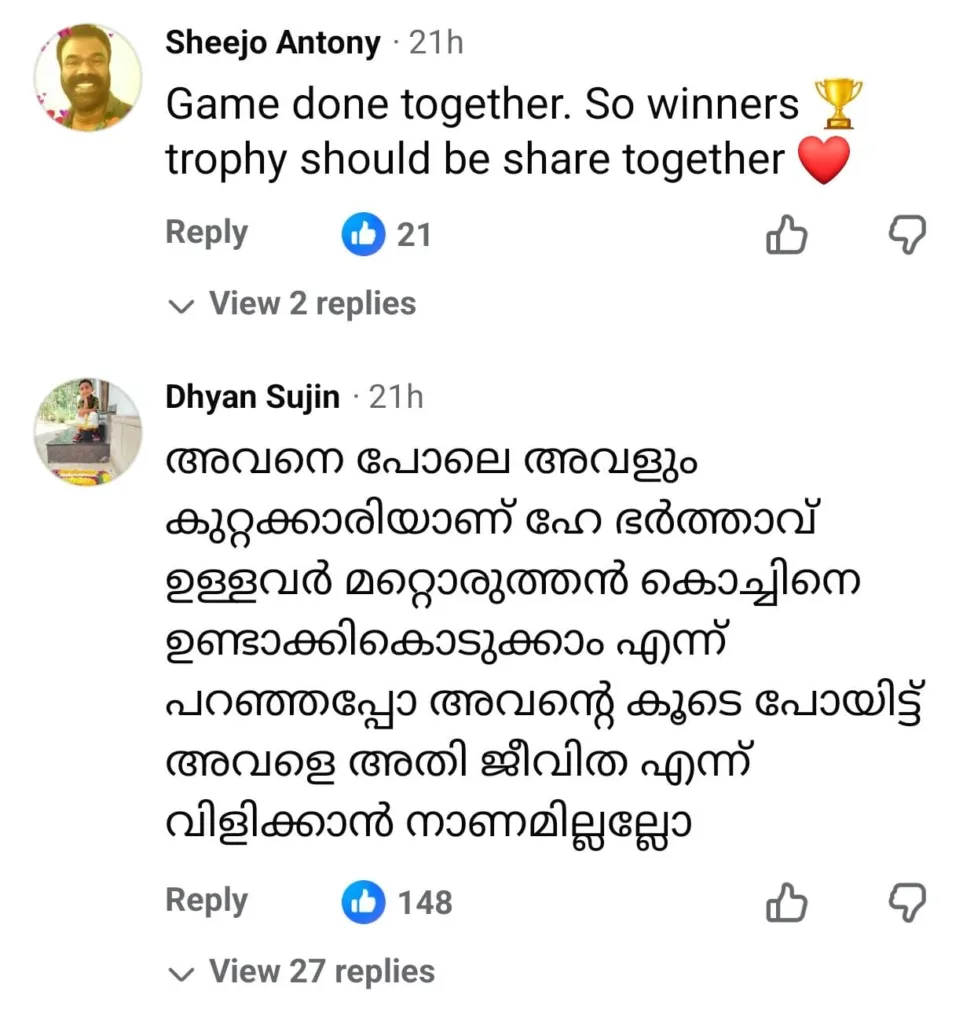 താരതമ്യേനെ ‘നിഷ്പക്ഷം’ എന്ന് തോന്നിക്കുന്ന, എന്റർടൈൻമെന്റ് കൊണ്ടെന്റുകൾ ചെയ്യുന്ന ചില അക്കൗണ്ടുകളിൽ നിന്നും രാഹുലിനെ പിന്തുണച്ചുകൊണ്ടുള്ള പോസ്റ്റുകളുടെ ഒഴുക്ക് കാണാം. ഒറ്റ നോട്ടത്തിൽ ’അപകടകര’മാണെന്ന് തോന്നിക്കാത്ത ഇത്തരം പോസ്റ്റുകളുടെ കമന്റ് ബോക്സുകൾ തുറന്നാൽ കാര്യങ്ങൾ വ്യക്തമാകും. ‘വിവാഹിതയായ, ഭർത്താവിനെ വഞ്ചിച്ച സ്ത്രീ’ എന്ന തരത്തിലുള്ള വ്യാഖ്യാനങ്ങൾ ശക്തിപ്പെടുത്താൻ ഇത്തരം അക്കൗണ്ടുകൾ അക്ഷീണം പ്രയത്നിക്കുന്നതായാണ് വ്യക്തമാകുന്നത്.