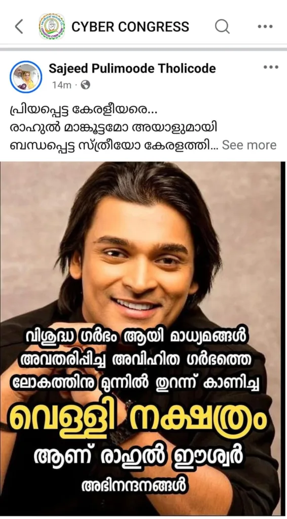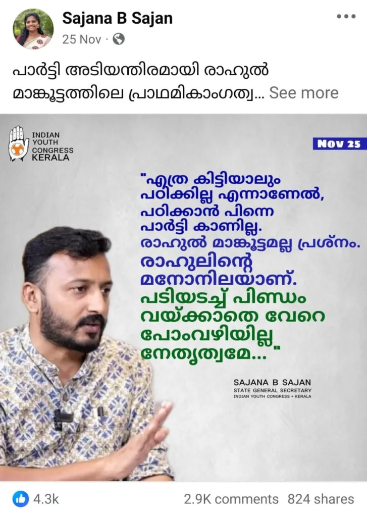ഇതുപോലെ കോൺഗ്രസ്സിന്റെ ഔദ്യോഗിക സ്ഥാനങ്ങൾ വഹിക്കുന്ന വ്യക്തികൾ, ഒരു ലക്ഷത്തിനടുത്ത് അംഗങ്ങളുള്ള കോൺഗ്രസ്സിന്റെ ഫേസ്ബുക്ക് ഗ്രൂപ്പുകൾ, രാഹുലിനെയും അതിജീവിതയെയും പരാമർശിക്കുന്ന പോസ്റ്റുകളുടെ കമന്റ് ബോക്സുകൾ, എല്ലായിടങ്ങളും പരാതിക്കാരിയായ സ്ത്രീക്കെതിരെയുള്ള അധിക്ഷേപങ്ങളും ലൈംഗിക പരാമർശങ്ങളും കൊണ്ട് നിറയുകയാണ്.