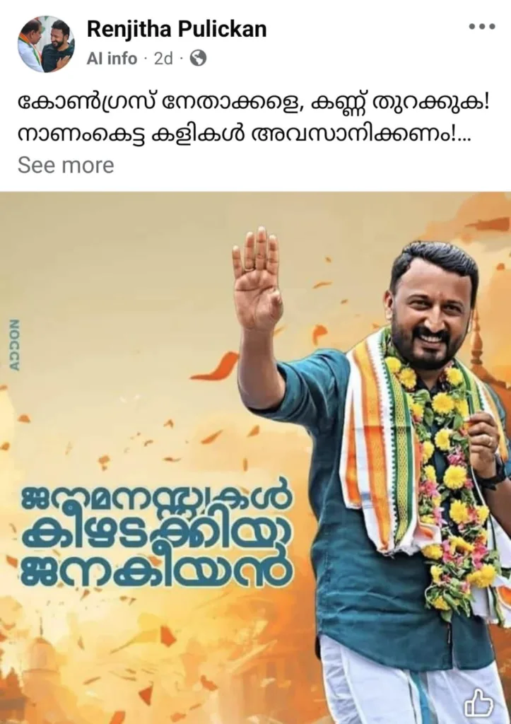 ഇതേ അക്കൗണ്ടിൽ നിന്ന് ‘ജനമനസ്സുകൾ കീഴടക്കിയ നായകൻ’ എന്ന തലക്കെട്ടോടെ രാഹുലിന്റെ ചിത്രം പോസ്റ്റ് ചെയ്യപ്പെട്ടിരുന്നു. ഇതിന്, 2600ന് മുകളിൽ ലൈക്കുകളും 300 കമന്റുകളും 170 ഷെയറുകളുമാണ് ലഭിച്ചത് (നവംബർ 28). ഇതേ പോസ്റ്റ്, സമാനമായ അടിക്കുറിപ്പുകളോടെ മറ്റ് കോൺഗ്രസ്സ് അക്കൗണ്ടുകളിലും കാണാം. ‘ഈ നിമിഷം മുതൽ പ്രതിരോധമല്ല, ശക്തമായ പ്രത്യാക്രമണമാണ് വേണ്ടത്’ എന്നാണ് പ്രസ്തുത പോസ്റ്റിന്റെ അവസാന വരി.