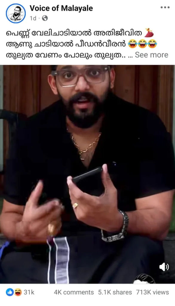 “സുന്ദരന്മാരായ ചെറുപ്പക്കാരോട് ചേർന്ന് നിൽക്കുമ്പോൾ കാമം തോന്നാത്ത, കുടുംബത്തിൽ പിറന്ന ഏത് പെണ്ണിനും ഏതൊരുത്തനോടൊപ്പവും ധൈര്യപൂർവ്വം ഏത് സാഹചര്യത്തിലും ഇങ്ങനെ നിൽക്കാം.”