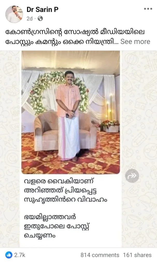നവംബർ 29ന്, സിപിഎം നേതാവ് ഡോ. പി സരിൻ ഫേസ്ബുക്കിൽ ഒരു ചിത്രം പങ്കുവച്ചിരുന്നു. കോൺഗ്രസിന്റെ സോഷ്യൽ മീഡിയ പ്രവർത്തനങ്ങൾ നിയന്ത്രിക്കുന്ന IRT Content Sharing എന്ന വാട്സ്ആപ്പ് ഗ്രൂപ്പിന്റേതെന്ന് അവകാശപ്പെടുന്ന സ്ക്രീൻ ഷോട്ടായിരുന്നു അത്.
