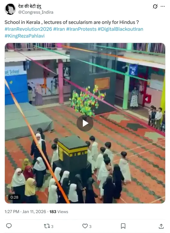 2026 ജനുവരി പതിനൊന്നിന്, ‘ദേശ് കി ബേട്ടി ഇന്ദു’ (देश की बेटी इंदु) എന്ന് പേരുള്ള എക്സിലെ ഒരു വലതുപക്ഷ ട്രോൾ അക്കൗണ്ടിൽ, ഈ വീഡിയോ പ്രചരിച്ചിട്ടുണ്ട്. കേരളത്തിലെ സ്കൂളിൽ വിദ്യാർഥികൾ തവാഫ് ചെയ്യുന്നു എന്നാണ് വീഡിയോയ്ക്ക് കൊടുത്തിരിക്കുന്ന ക്യാപ്ഷൻ. ഇതോടൊപ്പം, വീഡിയോയുമായി യാതൊരു ബന്ധവുമില്ലാത്ത ഇറാൻ റിവൊല്യൂഷൻ2026, ഇറാൻ, ഇറാൻ പ്രോട്ടസ്റ്റസ്, ഡിജിറ്റൽബ്ലാക്ക്ഔട്ട്ഇറാൻ എന്നീ ഹാഷ്ടാഗുകളും പോസ്റ്റിൽ ഉപയോഗിച്ചിട്ടുള്ളതായി കാണാം.