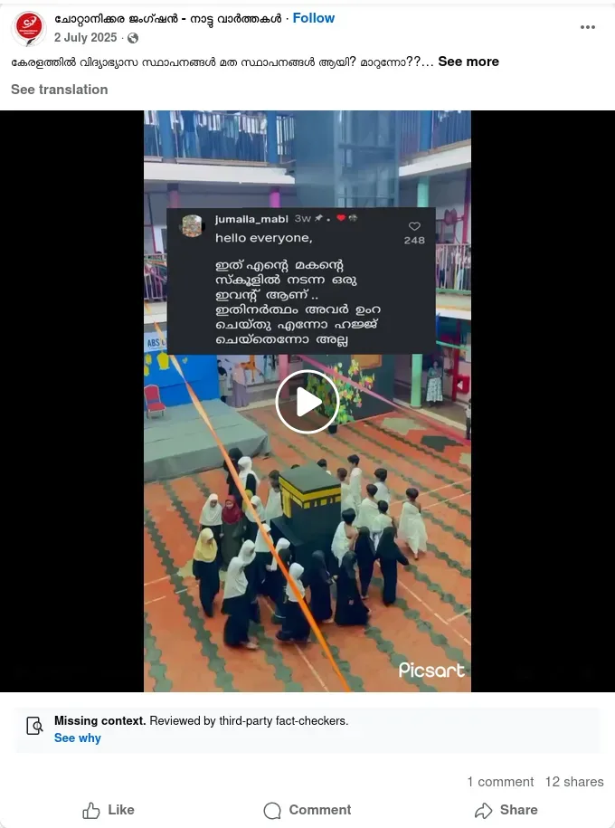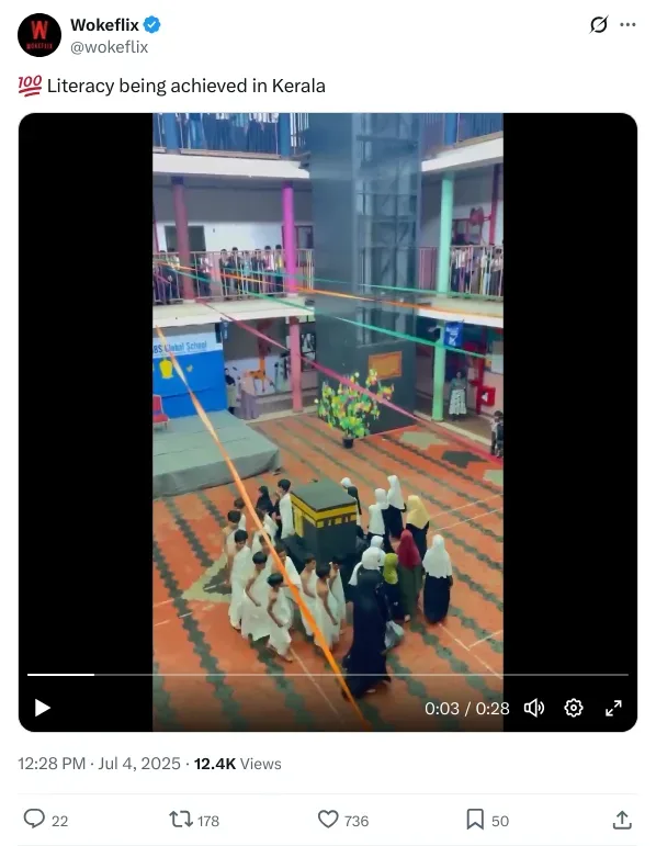 കേരളത്തിലെ വിദ്യാലയങ്ങളിൽ ഇസ്ലാമിക ചടങ്ങുകൾ അടിച്ചേൽപ്പിക്കുന്നു എന്ന ആരോപണവുമായി ഒരു വീഡിയോ കഴിഞ്ഞ ദിവസങ്ങളിൽ സമൂഹമാധ്യമങ്ങളിൽ വ്യാപകമായി പ്രചരിക്കുകയുണ്ടായി. 2026 ജനുവരി 11ന്, എക്സിൽ പ്രചരിച്ച വീഡിയോയിൽ, ഒരു കൂട്ടം വിദ്യാർത്ഥികൾ കഅബയെ വലംവെക്കുന്ന ‘തവാഫ്’ എന്ന ചടങ്ങ് അനുകരിക്കുന്നത് കാണാം. ഇത് നടന്നത് കേരളത്തിലെ സർക്കാർ സ്കൂളിലാണ് എന്ന് അവകാശപ്പെട്ടുകൊണ്ടാണ് വീഡിയോ പ്രചരിപ്പിക്കുന്നത്. മതേതരത്വത്തിന്റെ മറവിൽ കേരളത്തിൽ ഇസ്ലാമിക വൽക്കരണം നടത്തുന്നു എന്ന വാദത്തോടെയാണ് വീഡിയോ പ്രചരിക്കുന്നത്. 2025 ജൂലൈയിലും സമാനമായ രീതിയിൽ ഈ വീഡിയോ പ്രചരിച്ചിരുന്നു. ഇത് ഒരു സ്വകാര്യ മുസ്ലിം മാനേജ്മെന്റ് സ്കൂളിലെ ബലിപെരുന്നാൾ ആഘോഷമായിരുന്നുവെന്നാണ് ഞങ്ങൾ നടത്തിയ വസ്തുതാ പരിശോധനയിൽ വ്യക്തമായത്. കേരളത്തിന്റെ മതേതര പ്രതിച്ഛായയെ തകർക്കാൻ ലക്ഷ്യമിട്ട് നടക്കുന്ന ആസൂത്രിതമായ വ്യാജപ്രചാരണങ്ങളുടെ തുടർച്ചയായി വേണം ഈ വീഡിയോയെ കാണേണ്ടത്.