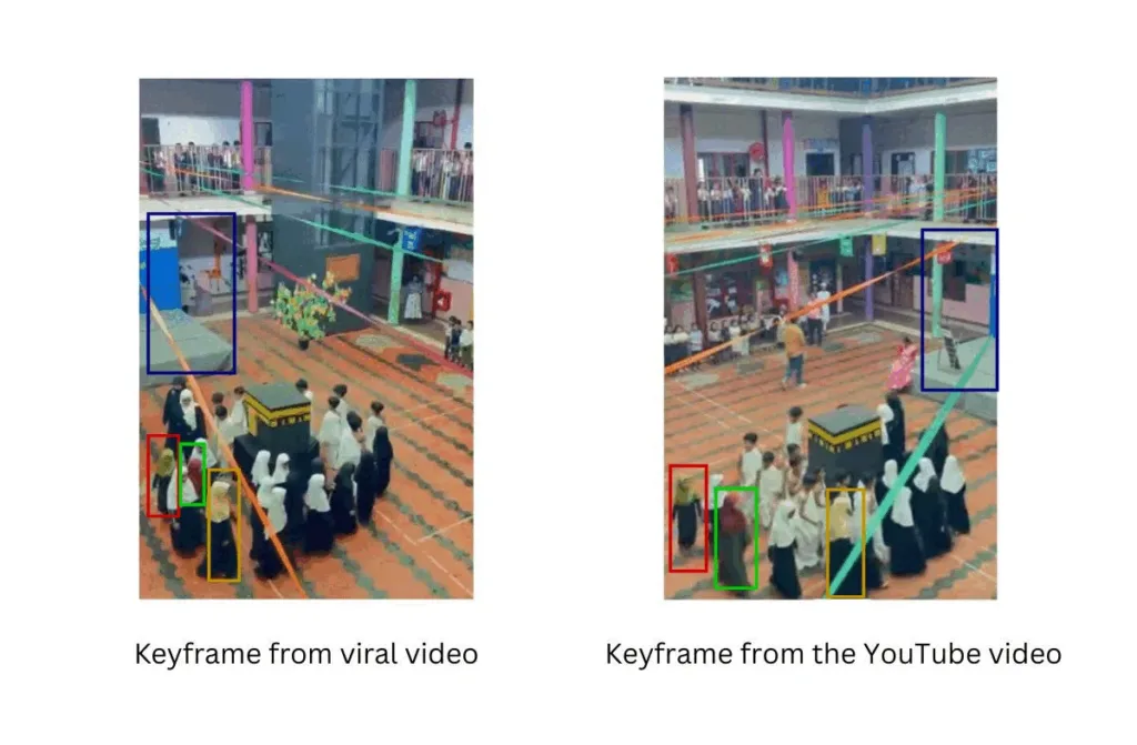 തുടരന്വേഷണത്തിന്റെ ഭാഗമായി, എബിഎസ് ഗ്ലോബൽ സ്കൂളിന്റെ ഔദ്യോഗിക യൂട്യൂബ് ചാനൽ പരിശോധിച്ചപ്പോൾ, 2025 ജൂൺ മൂന്നിന് അപ്ലോഡ് ചെയ്ത ഒരു യൂട്യൂബ് വീഡിയോ കണ്ടെത്താൻ സാധിച്ചു. ഇപ്പോൾ പ്രചരിക്കുന്ന വീഡിയോയിലേതിന് സമാനമായി വിദ്യാർത്ഥികൾ തവാഫ് അനുകരിക്കുന്നതിന്റെ മറ്റൊരു ആംഗിളിലുള്ള ദൃശ്യം ഈ വീഡിയോയിലും കാണാം. സ്റ്റേജിന് മുകളിൽ ‘Happy Eid ul Adha Mubarak’ എന്ന് വലിയ അക്ഷരത്തിൽ എഴുതിയിരിക്കുന്നത് വീഡിയോയിൽ വ്യക്തമായി കാണാം. ഇതിൽ നിന്ന് തന്നെ, ഇത് സ്കൂളിലെ ബലിപെരുന്നാൾ ആഘോഷത്തിന്റെ ഭാഗമായി സംഘടിപ്പിച്ച പരിപാടിയാണെന്ന് ഉറപ്പിക്കാം. രണ്ട് വീഡിയോകളിലെയും കീഫ്രെയിമുകൾ തമ്മിൽ താരതമ്യം ചെയ്തപ്പോൾ, ഇവ രണ്ടും ഒരേ സ്ഥലത്ത്, ഒരേ സമയത്ത് നടന്ന പരിപാടിയുടേതാണെന്ന് വ്യക്തമായി.
