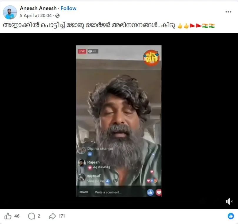 ഏപ്രില് 5ന് Aneesh Aneesh എന്ന ഫേസ്ബുക്ക് അക്കൗണ്ടില് നിന്നാണ് ഈ വീഡിയോ ഷെയര് ചെയ്യപ്പെട്ടിട്ടുള്ളത്. ‘ഇടതിന്റെയും വലത്തിന്റെയും അണ്ണാക്കില് പൊട്ടിച്ച് ജോജു ജോര്ജ്ജ്’ എന്നാണ് വീഡിയോയുടെ തമ്പ്നെയ്ലിലെ തലക്കെട്ട്. ജോജുവിന്റെ യഥാർത്ഥ ഫേസ്ബുക്ക് ലൈവ് ആണ് ഇത് എന്ന രീതിയിലാണ് വീഡിയോ പ്രചരിക്കുന്നത്.