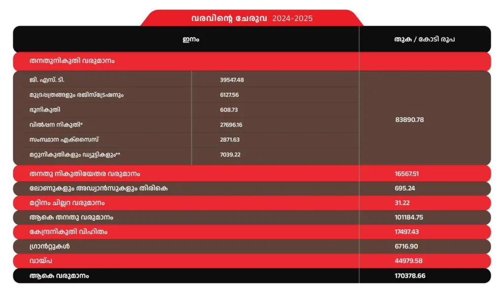 ഇവിടെ ഒരു പട്ടിക കൊടുത്തിട്ടുണ്ട്. കഴിഞ്ഞ സാമ്പത്തിക വർഷത്തെ (2024-2025) കേരളത്തിന്റെ വരമാനമാണ് ഇതിലുള്ളത്. CAG യുടെ പ്രാഥമിക കണക്കുകളാണ് ആധാരം.
