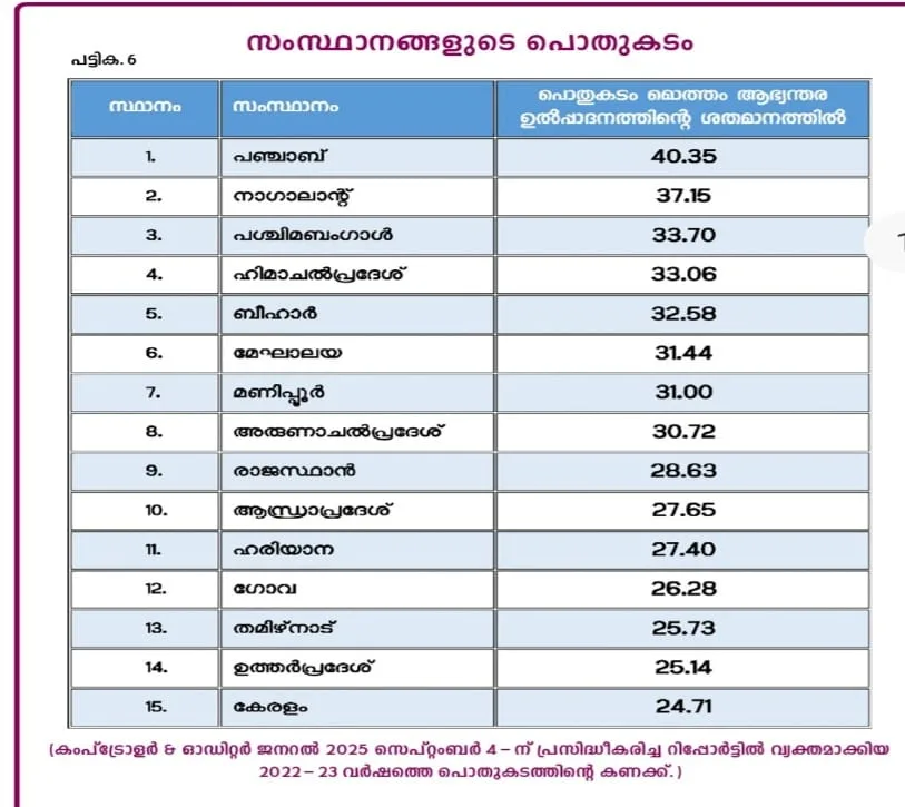 കേരളം കടം കൊണ്ട് മുങ്ങിത്താഴുന്നു എന്ന പ്രചണ്ഡമായ പ്രൊപ്പഗണ്ടയുടെ പൊള്ളത്തരം CAG റിപ്പോർട്ട് വെളിവാക്കിയിട്ടുണ്ട്. 2013-2014 മുതൽ 2022-2023 വരെയുള്ള ഒരു ദശകത്തിലെ പ്രവണതകൾ CAG ഈ റിപ്പോർട്ടിൽ വിശകലനം ചെയ്തു. എന്താണ് സംസ്ഥാനങ്ങളുടെ ധന സ്ഥിതിയിലെ ദീർഘകാല പ്രവണത എന്നു CAG നോക്കി എന്നു സാരം. CAG റിപ്പോർട്ടിൽ കേരളം കടം കൊണ്ട് മുടിഞ്ഞ ഒരു സംസ്ഥാനമല്ല (debt strained) എന്നാണ് പറയുന്നത്. അങ്ങനെ ചുമ്മാ പറയുകയല്ല ഈ റിപ്പോർട്ട് (State Finances 2022-23 : Comptroller and Auditor General of India) ചെയ്യുന്നത്. 28 സംസ്ഥാനങ്ങളിൽ എട്ടെണ്ണത്തിനു മുപ്പതു ശതമാനത്തിൽ അധികം പൊതുക്കടം (Public Debt) ഉള്ളവയാണ്. പതിന്നാലു സംസ്ഥാനങ്ങളുടെ പൊതുക്കടം 20 നും 30 നും ഇടയിലാണ്. ഇതിലാണ് കേരളം വരുന്നത്. കേരളത്തിന്റെ പൊതുക്കടം കൃത്യമായി പറഞ്ഞാൽ 24.71 ശതമാനമാണ്. ആ ബ്രാക്കറ്റിൽ തന്നെ കേരളം ഏഴാമതാണ്. ഈ പൊതുക്കടം 2023-2024 ൽ 23.38 ശതമാനമായും 24-25 ൽ 23.33 ശതമാനമായും കുറഞ്ഞു എന്നതും ബജറ്റ് രേഖകൾ നോക്കിയാൽ മനസിലാകും.