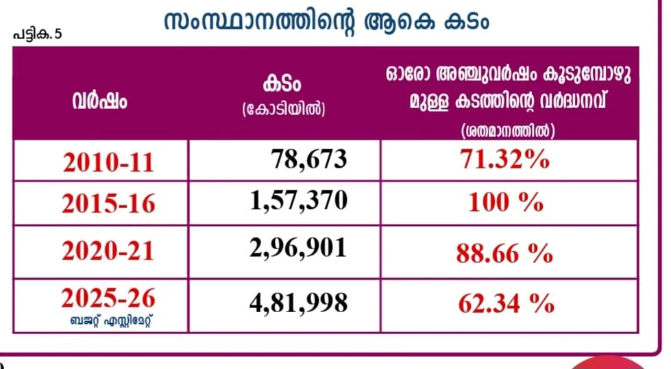 കടം ഇരട്ടിക്കുന്നതിന്റെ കഥ എന്താണ്? 2006-2011 കാലത്തെ വർദ്ധനവ് 71.32 ശതമാനമായിരുന്നു. 2011- 2016 കാലത്ത് വർദ്ധനവ് 100 ശതമാനമായി. 2016-2021 കാലത്തെ വർദ്ധനവ് 88.6 ശതമാനമായിരുന്നു. 2021-2026 കാലത്ത് ബജറ്റ് കണക്കുകൾ പ്രകാരം ഈ വർദ്ധനവ് 62.34 ശതമാനം മാത്രമായിരിക്കും. 2026 മാർച്ചിൽ എല്ലാം ചേരുന്ന സംസ്ഥാനത്തിന്റെ ആകെ കട ബാധ്യത 4.82 ലക്ഷം കോടി രൂപയായിരിക്കും എന്നാണ് അനുമാനം. കടം- ജിഡിപി അനുപാതവും ഇത് പോലെ കുറയുകയാണ്. 2000 മുതൽ 2025 വരെയുള്ള സഞ്ചിത കടം GSDPയുടെ ശതമാനമായി നോക്കിയാൽ ഏറ്റവും ഉയർന്ന കടം/GSDP അനുപാതം 2004-2005 ലായിരുന്നു. 41.65 ശതമാനം. തൊട്ടു തലേക്കൊല്ലം 41.53 ശതമാനം. ഈ സഞ്ചിത കടം എന്നതിൽ ഇപ്പോഴത്തെ പോലെ ട്രഷറി നിക്ഷേപം ഒന്നും അന്ന് കണക്കിലെടുത്തിട്ടില്ല. അതു കൂടി ചേർന്നാൽ ഈ അനുപാതം 45 ശതമാനത്തിനും മുകളിലാകണം. അതുകൊണ്ട് കേരളം മുടിഞ്ഞു പോയി എന്ന നിലപാടില്ല. അതു ക്രമേണ താഴുകയാണ് ചെയ്തത്. 2010- 2011ൽ കടം GSDP അനുപാതം 28.4 ശതമാനമായിരുന്നു. 2020-21 ൽ കോവിഡിന്റെ പശ്ചാത്തലത്തിൽ പോലും വന്ന കടം GSDP അനുപാതം 38.51 ശതമാനമാണ്. സമ്പദ്ഘടന വീണ്ടെടുപ്പ് കൈവരിക്കുന്നതോടെ അതു സാധാരണ നിലയിലെത്തും എന്നതാണ് പറഞ്ഞത്. 2003-2005 ലെ 41- 42 ശതമാനത്തേക്കാൾ മുടിപ്പിക്കുന്ന കടമാണ് കോവിഡ് കാലത്തേത് എന്ന വാദമായിരുന്നല്ലോ നടത്തിയത്. ഇപ്പോൾ എത്രയായി 33.7 ശതമാനമായി കുറഞ്ഞു. എന്നാൽ ഇന്ത്യാ സർക്കാരിന്റെ കടം ആഭ്യന്തര വരുമാന അനുപാതം 60 ശതമാനമാണ്. യൂണിയൻ സർക്കാർ കടം കൊണ്ട് മുടിഞ്ഞു എന്നു പറയുന്നുണ്ടോ? എന്തായാലും കേരളം debt strained സംസ്ഥാനമാണ് എന്ന ആഖ്യാനം CAG റിപ്പോർട്ട് പൊളിച്ചിട്ടുണ്ട്.