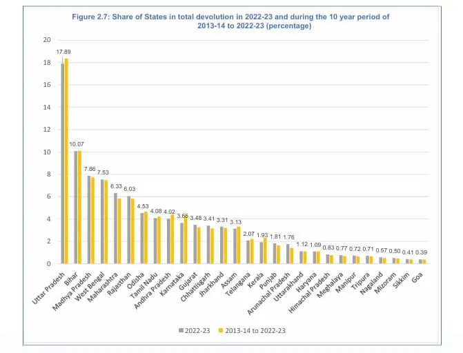 2022-2023 ലെ ആകെ യൂണിയൻ കൈമാറ്റത്തിന്റെ 73 ശതമാനം പത്തു സംസ്ഥാനങ്ങൾക്കാണ് ലഭിച്ചത് എന്നാണ് CAGയുടെ ദശാബ്ദ അവലോകന റിപ്പോർട്ട് വ്യക്തമാക്കിയത്. ഉത്തർ പ്രദേശ് (17.89%), ബീഹാർ(10.07%), മദ്ധ്യ പ്രദേശ് (7.86%), പശ്ചിമബംഗാൾ (7.53%), മഹാരാഷ്ട്ര (6.33%), രാജസ്ഥാൻ(6.03%), ഒഡീഷ (4.53%), തമിഴ്നാട്(4.08%), ആന്ധ്ര പ്രദേശ് (4.02%) കർണാടക (3.65%). എന്നിവയാണ് ഈ സംസ്ഥാനങ്ങൾ. 2013 മുതൽ 2023 വരെയുള്ള കണക്കുകൾ നോക്കിയാലും ഈ സംസ്ഥാനങ്ങൾക്ക് ആകെ യൂണിയൻ കൈമാറ്റത്തിന്റെ 73 ശതമാനം ലഭിച്ചു എന്നതാണ് റിപ്പോർട്ട് പറയുന്നത്. അതേ സമയം കേരളത്തിന് ഇക്കാലയളവിൽ ലഭിച്ചത് ആകെ യൂണിയൻ കൈമാറ്റത്തിന്റെ 1.93 ശതമാനമാണ്. നമുക്ക് ഇപ്പോഴത്തേതിനേക്കാൾ ഉയർന്ന നികുതി വിഹിതം ഉണ്ടായിരുന്നപ്പോഴും ആകെ യൂണിയൻ കൈമാറ്റത്തിൽ കേരളം നേരിട്ട വിവേചനത്തിന്റെ ചിത്രം വ്യക്തമാക്കുന്നതാണ് ഈ കണക്കുകൾ.