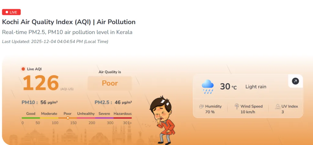 AQI.in ലെ വിവരങ്ങൾ പ്രകാരം, കഴിഞ്ഞ ദിവസങ്ങളിൽ കൊച്ചിയിലെ വായു ഗുണനിലവാരം അനാരോഗ്യകരം എന്ന വിഭാഗത്തിലാണുള്ളത്. ഇന്ത്യയിലെ വായു ഗുണനിലവാര സൂചികയുമായി ബന്ധപ്പെട്ട് തത്സമയ വിവരങ്ങൾ നൽകുന്ന സ്വതന്ത്ര ഓൺലൈൻ പ്ലാറ്റ്ഫോമാണ് AQI.in. കഴിഞ്ഞ ഒരു മാസത്തെ AQI.in വിവരങ്ങളുടെ അടിസ്ഥാനത്തിൽ, കൊച്ചിയിലെ വായുവിന്റെ ഗുണനിലവാരം നൂറിന് മുകളിലാണ്. ഏറ്റവും കുറഞ്ഞ അളവ് 92 ആണെങ്കിൽ കൂടുതൽ 178 ആണ്, നവംബർ നാല് മുതലുള്ള കണക്കാണിത്.