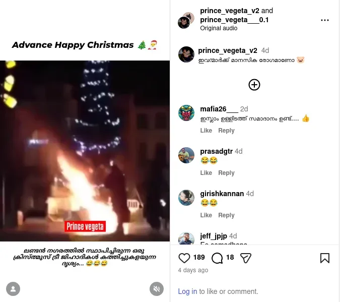 എബിവിപി(അഖില ഭാരതീയ വിദ്യാർത്ഥി പരിഷത്ത്) എന്ന വിദ്യാർത്ഥി സംഘടനയുമായി ബന്ധമുള്ള ശിഖ രാഘവൻ തോപ്പിൽ എന്ന അക്കൗണ്ട് വഴി ഡിസംബർ പതിനേഴിനാണ് വീഡിയോ പ്രചരിച്ചതായി കണ്ടത്.”ലണ്ടൻ നഗരത്തിൽ സ്ഥാപിച്ചിരുന്ന ഒരു ക്രിസ്തുമസ് ട്രീ ജിഹാദികൾ കത്തിച്ചുകളയുന്ന ദൃശ്യം” എന്നാണ് പോസ്റ്റിന് മലയാളത്തിൽ ഉള്ള വിവരണം. ഡിസംബർ 22 വരെ 96 പേർ ഈ പോസ്റ്റ് ഷെയർ ചെയ്തതായി കാണുന്നു, 217 ലൈക്കുകളും 57 കമൻ്റുകളും ഈ പോസ്റ്റിന് ലഭിച്ചിട്ടുണ്ട്.