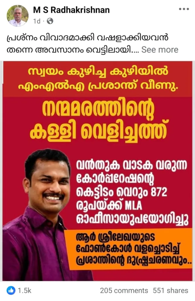 “പ്രശ്നം വഷളാക്കിയവൻ തന്നെ അവസാനം വെട്ടിലായി. നന്മ മരത്തിന്റെ കള്ളി വെളിച്ചത്ത്. എം എൽ എ വാടകയിനത്തിൽ ഗവണ്മെന്റിൽ നിന്നും മാസം കൈപ്പറ്റുന്നത് 25000 രൂപ വച്ച്.. വാടക കൊടുക്കുന്നത് 827 രൂപയും. അതായത് മാസം 24128 രൂപ വച്ച് എം എൽ എയുടെ പോക്കറ്റിലേക്ക് പോകുന്നു. കഴിഞ്ഞ നാലേമുക്കാൽ വർഷം കൊണ്ട് പുള്ളി ഈയിനത്തിൽ മാത്രം അടിച്ചു മാറ്റിയത് 14 ലക്ഷം രൂപയോളം!!”