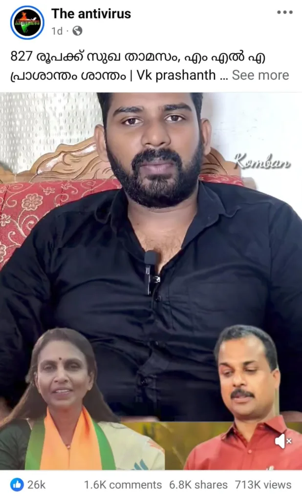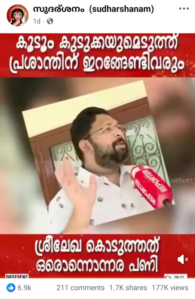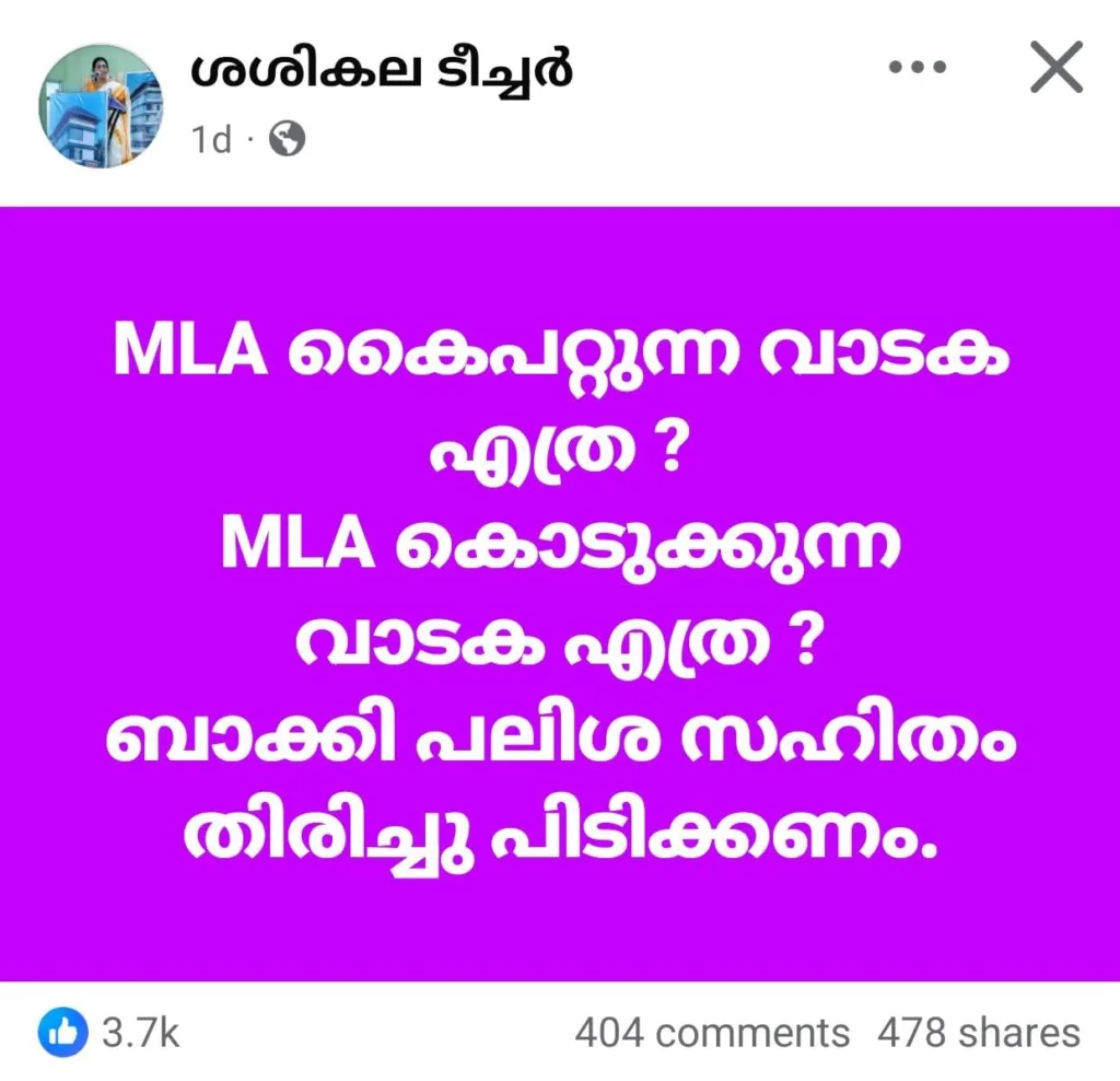 “എം എൽ എ കൈപ്പറ്റുന്ന വാടകയെത്ര? എം എൽ എ കൊടുക്കുന്ന വാടകയെത്ര? ബാക്കി പലിശ സഹിതം തിരിച്ചു പിടിക്കണം”. തീവ്ര ഹിന്ദുത്വ സ്വഭാവമുള്ള പോസ്റ്റുകളും വ്യാജ വാർത്തകളും നിരന്തരമായി പങ്കു വയ്ക്കാറുള്ള ശശികല ടീച്ചർ എന്ന ഫേസ്ബുക്ക് അക്കൗണ്ടിൽ നിന്നു പങ്കു വച്ച പോസ്റ്റിന് 3700ൽ അധികം ലൈക്കുകളും അഞ്ഞൂറോളം ഷെയറുകളുമാണ് ലഭിച്ചിട്ടുള്ളത് (ഡിസംബർ 30 വരെ).