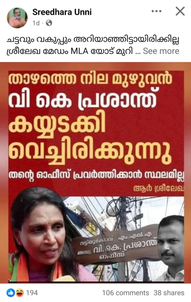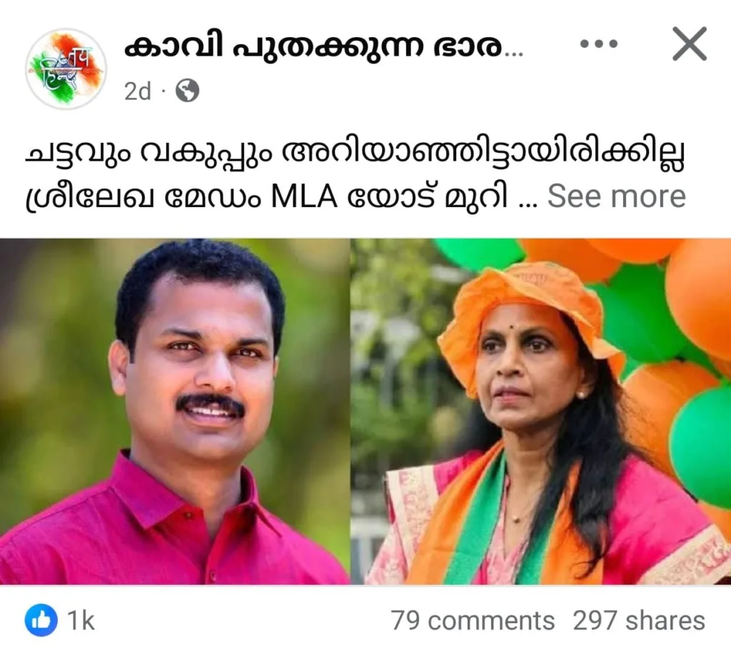 “ചട്ടവും വകുപ്പും അറിയാഞ്ഞിട്ടായിരിക്കില്ല ശ്രീലേഖ മേഡം MLA യോട് മുറി ഒഴിയാൻ ആവശ്യപ്പെട്ടത്. കാലാകാലങ്ങളായി ഭരിക്കുന്നിടത്തും ഭരിച്ചിടത്തും ഇവരൊക്കെ എന്തല്ലാം സൗകര്യങ്ങൾ ഉപയോഗപ്പെടുത്തുന്നുണ്ട് എന്ന് നാലാളറിയട്ടെ എന്ന് കരുതി തന്നെ ആയിരിക്കണം.” ‘കാവി പുതക്കുന്ന ഭാരതം’ എന്ന പേജിൽ നിന്ന് ഡിസംബർ 28 പുലർച്ചേ 12:27ന് പങ്കു വെച്ച പോസ്റ്റ് തുടങ്ങുന്നത് ഇങ്ങനെയാണ് . ഡിസംബർ 30 വരെ ആയിരത്തിലധികം ലൈക്കുകളാണ് ഈ പോസ്റ്റിന് ലഭിച്ചത്.