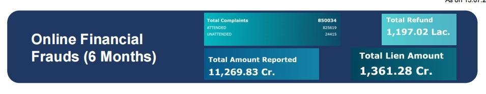 ആഭ്യന്തര മന്ത്രാലയത്തിന്റെ കീഴിൽ, രാജ്യത്തെ സൈബർ കുറ്റകൃത്യങ്ങൾ കൈകാര്യം ചെയ്യുന്ന സ്ഥാപനമായ ഇന്ത്യൻ സൈബർ ക്രൈം കോർഡിനേഷൻ സെന്ററിന്റെ (ഐ4സി) കണക്ക് പ്രകാരം, ഓരോ ദിവസവും ഏകദേശം 50 കോടിയിലേറെ രൂപയാണ് ഓൺലൈൻ സാമ്പത്തിക തട്ടിപ്പുകളിൽ ഇന്ത്യക്കാർക്ക് നഷ്ടമാകുന്നത്. റിപ്പോർട്ട് ചെയ്യപ്പെടുന്ന തുകകളിൽ 35 ശതമാനത്തിലധികവും 50 ലക്ഷം രൂപയ്ക്ക് മുകളിൽ വരുന്നതാണ്. ശരാശരി 7000ന് മുകളിൽ സൈബർ കുറ്റകൃത്യങ്ങൾ സംബന്ധിക്കുന്ന പരാതികളാണ് ഒരു ദിവസം രാജ്യത്ത് റിപ്പോർട്ട് ചെയ്യപ്പെടുന്നത് (മെയ് 2024ലെ കണക്ക് അനുസരിച്ച്). 8,50,034 പരാതികളിൽ നിന്നായി 11,269.83 കോടി രൂപയാണ് 2024 ജനുവരിക്കും ജൂണിനും ഇടയിലായി ഓൺലൈൻ സാമ്പത്തിക തട്ടിപ്പുകളിൽ ഉൾപ്പെട്ടതായി റിപ്പോർട്ട് ചെയ്തിട്ടുള്ളത്. ഇതിൽ 24,415 പരാതികൾ പരിഗണിക്കപ്പെട്ടിട്ടില്ല. (2024 ജൂലൈ 15ലെ കണക്കനുസരിച്ച്).
