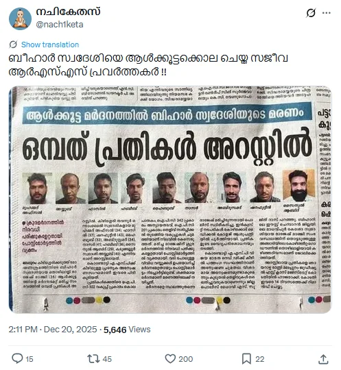 “ബീഹാർ സ്വദേശിയെ ആൾക്കൂട്ടക്കൊല ചെയ്ത സജീവ ആർഎസ്എസ് പ്രവർത്തകർ” എന്ന് പരിഹാസരൂപേണയുള്ള തലക്കെട്ടാണ് ഇവർ ഉപയോഗിച്ചിട്ടുള്ളത്. ഏകദേശം പതിനാറായിരത്തോട് അടുത്ത് ഫോളോവെഴ്സ് ഉള്ള ഒരു എക്സ് അക്കൗണ്ടാണിത്. “പന്നികളെ വെടിവച്ചു കൊല്ലണം” എന്നതുൾപ്പെടെയുള്ള തികച്ചും വർഗീയമായ കമന്റുകൾ ആണ് ഈ പോസ്റ്റിനു താഴെയുള്ളത്.