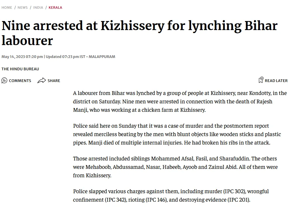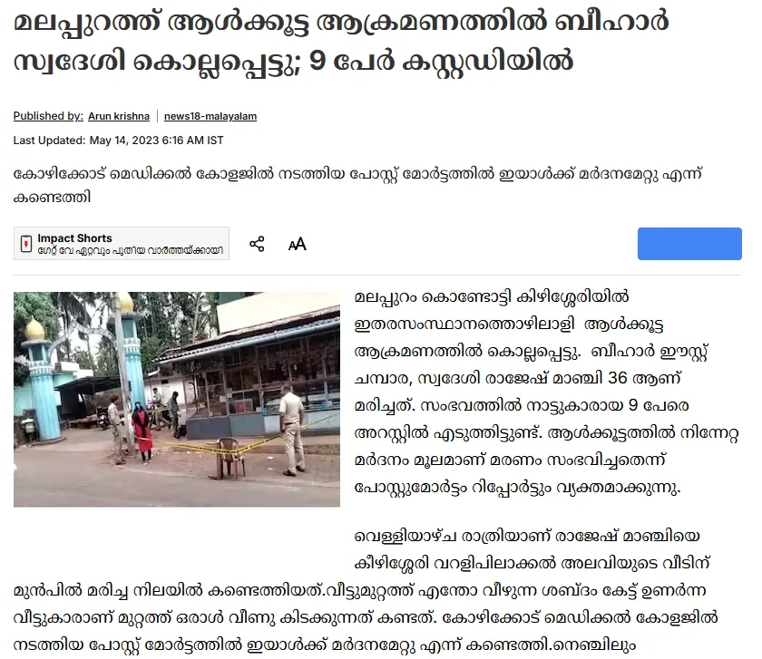 വാർത്തയുടെ ആദ്യ വാചകത്തിൽ തന്നെ, ‘കിഴിശ്ശേരിക്കടുത്ത് മോഷണശ്രമത്തിനിടെ ബിഹാർ സ്വദേശിയായ തൊഴിലാളി രാജേഷ് മാഞ്ചി (36) ആൾക്കൂട്ടത്തിന്റെ മർദനമേറ്റ് മരിച്ച സംഭവത്തിൽ ഒമ്പത് പ്രതികൾ അറസ്റ്റിൽ’ എന്ന് വ്യക്തമായി രേഖപ്പെടുത്തിയിട്ടുണ്ട്.