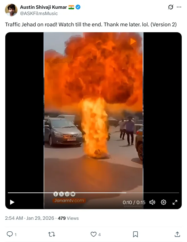 എഐ ഉപയോഗിച്ച് നിർമ്മിച്ച മറ്റൊരു വീഡിയോയിൽ നിസ്കരിച്ചു കൊണ്ടിരിക്കുന്ന അനീസ പൊട്ടിതെറിക്കുന്നതായി കാണാം. ‘ആസ്റ്റിൻ ശിവാജി കുമാർ’ എന്നയാളാണ് ജനുവരി 29 നു ‘ട്രാഫിക് ജിഹാദ്’ എന്നാരോപിച്ച് വീഡിയോ പോസ്റ്റ് ചെയ്തത്.