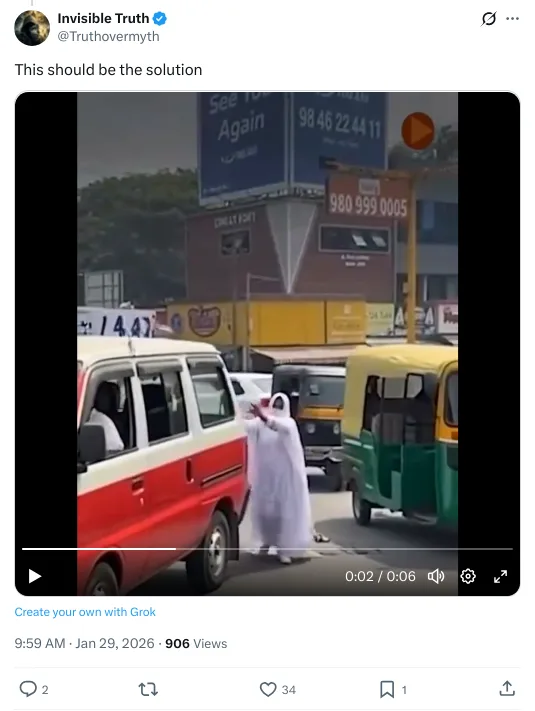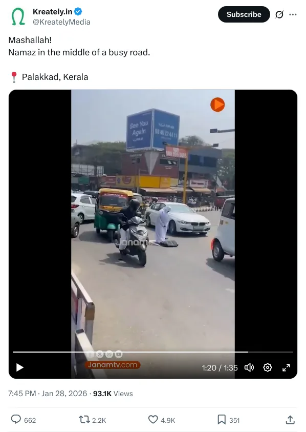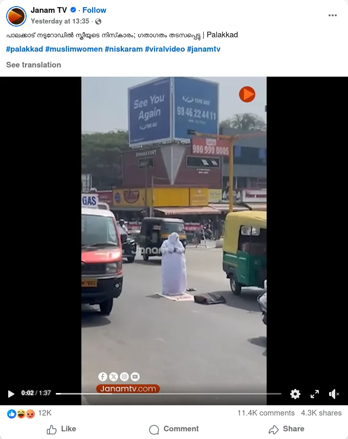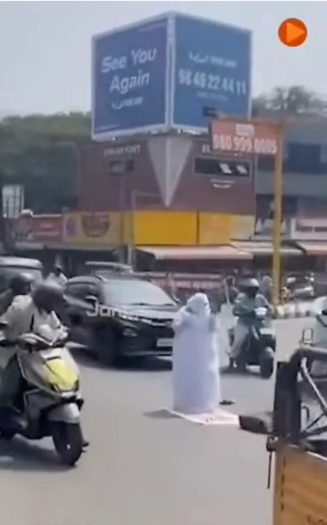 തിരക്കുള്ള റോഡിന് നടുക്ക് മക്കനയണിഞ്ഞ് നിസ്കരിക്കാൻ ശ്രമിക്കുന്ന ഒരു സ്ത്രീ. റോഡിൽ നിന്ന് മാറി നിൽക്കാൻ വഴി യാത്രക്കാർ ആവശ്യപ്പെടുന്നുണ്ടെങ്കിലും അവരോടൊക്കെ തർക്കിച്ച് അവർ നിസ്കാരം തുടരുന്നു. ഇതാണ് പ്രചരിക്കുന്ന വീഡിയോയുടെ ഉള്ളടക്കം. ഒരു മിനുട്ടും 31 സെക്കന്റും മാത്രം ദൈർഘ്യമുള്ള ഈ വീഡിയോ വിവിധ സാമൂഹ്യ മാധ്യമങ്ങളിലായി ലക്ഷകണക്കിന് പേരാണ് കണ്ടിരിക്കുന്നത്.