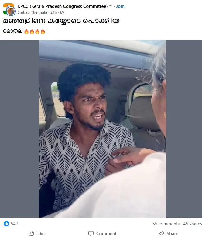 ‘അച്ചു 2.0’ എന്ന ഒരു എക്സ് അക്കൗണ്ടിൽ ഒരു ഫോട്ടോ ഇന്നലെ (08/04/2026) പ്രചരിച്ചിരുന്നു. ” ഷാഫി പറമ്പിൽ ആർമിയിൽ ഉള്ളവനാണ്. ഇതാണ് കോൺഗ്രസുകാരുടെ സംസ്കാരം അമ്മയുടെ പ്രായമുള്ള ആളോടാണ് ഇവൻ ഇത് കാണിക്കുന്നത്” എന്ന കുറിപ്പോടെയാണ് ചിത്രം പോസ്റ്റ് ചെയ്തിട്ടുള്ളത്. എക്സിലെ ഒരു വെരിഫൈഡ് അക്കൗണ്ടാണ് ഇത്.