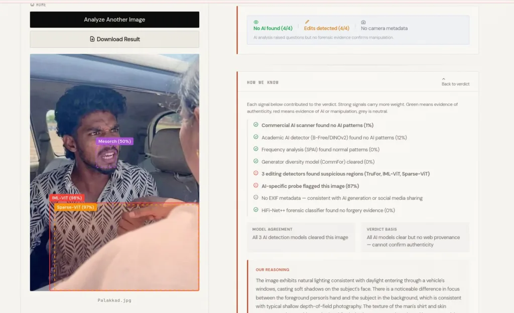 ബിജെപി അനുകൂല അക്കൗണ്ടുകളിൽ പ്രചരിച്ച പോസ്റ്റ് എ ഐ നിർമിതം ആണെന്ന സൂചനയാണ് Image Whisperer ടൂൾ നൽകുന്നത്. ചിത്രത്തിലെ ചില ഭാഗങ്ങളിൽ വ്യക്തത കുറവുണ്ട്, മുഹമ്മദ് ഷായുടെ മുഖത്തിൻ്റെയും കൈയുടെയും ക്ലാരിറ്റിയിൽ പ്രകടമായ വ്യത്യാസമുണ്ട്, ടൂളിൻ്റെ നിഗമനം ഇങ്ങനെയാണ്.