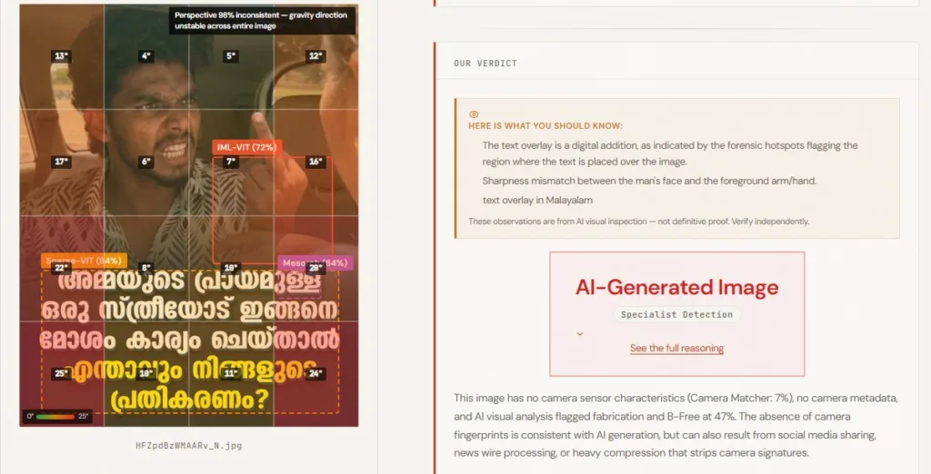 Image Whisperer ടൂൾ ഉപയോഗിച്ച് ഇത് പരിശോധിച്ചു. ചിത്രത്തിൽ നാല് ഭാഗത്ത് എഡിറ്റ് ചെയ്തിട്ടുണ്ട് എന്നാണ് ടൂൾ നിഗമനം.