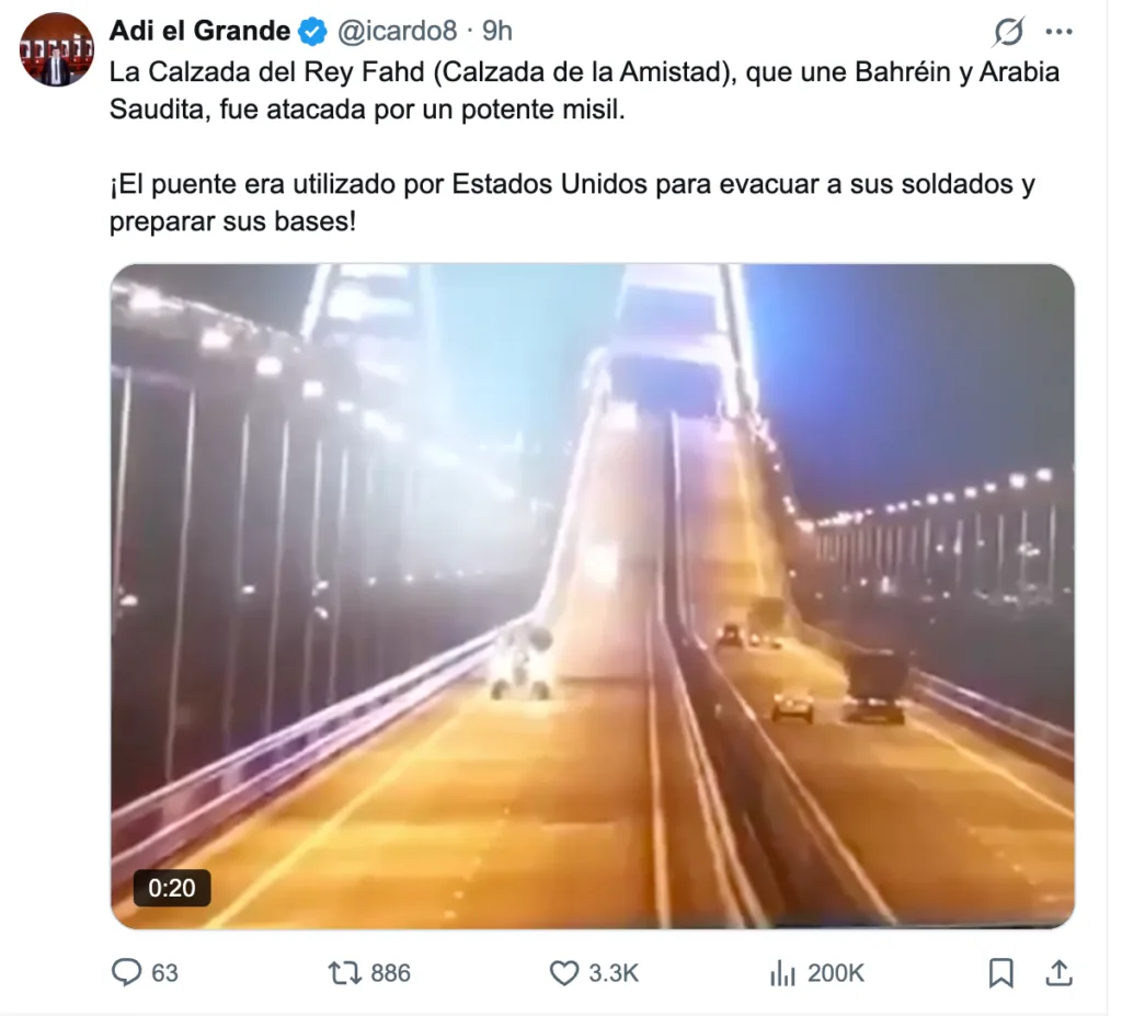 “ബഹ്റൈനെയും സൗദി അറേബ്യയെയും ബന്ധിപ്പിക്കുന്ന കിംഗ് ഫഹ്ദ് കോസ്വേ (ഫ്രണ്ട്ഷിപ്പ് കോസ്വേ) ശക്തമായ ഒരു മിസൈൽ ആക്രമണത്തിനിരയായി. അമേരിക്ക തങ്ങളുടെ സൈനികരെ ഒഴിപ്പിക്കുന്നതിനും താവളങ്ങൾ ഒരുക്കുന്നതിനും ഈ പാലം ഉപയോഗിച്ചിരുന്നു.” എന്ന അടിക്കുറിപ്പോടെയാണ് ‘@icardo8’ ഇത് പോസ്റ്റ് ചെയ്തിരിക്കുന്നത്. ഇറാനെ അനുകൂലിച്ചും പ്രതികൂലിച്ചും 63 പേരാണ് ഈ പോസ്റ്റിൽ കമ്മന്റ് ചെയ്തിട്ടുള്ളത്. വീഡിയോ വ്യാജമാണെന്നും കമന്റുകളിൽ ചിലർ ആരോപിക്കുന്നുണ്ട്.