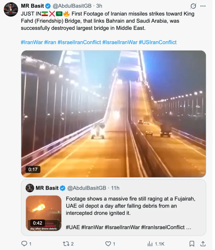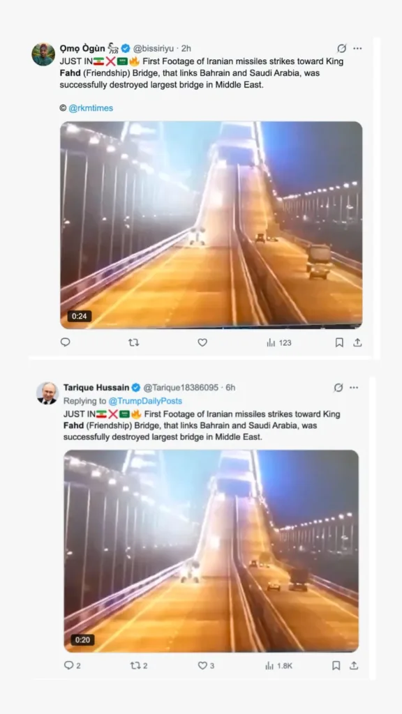 “ബഹ്റൈനെയും സൗദി അറേബ്യയെയും ബന്ധിപ്പിക്കുന്ന കിംഗ് ഫഹ്ദ് (ഫ്രണ്ട്ഷിപ്പ്) പാലത്തിന് നേരെ ഇറാനിയൻ മിസൈലുകൾ ആക്രമണം നടത്തിയതിന്റെ ആദ്യ ദൃശ്യങ്ങൾ ഇതാ. മിഡിൽ ഈസ്റ്റിലെ ഏറ്റവും വലിയ പാലം വിജയകരമായി തകർന്നു.” എന്നാണ് ഈ പോസ്റ്റിന്റെ അടിക്കുറിപ്പ്. എക്സിലെ കൂടുതൽ പരിശോധനയിൽ, ഇതേ അടിക്കുറിപ്പ് തന്നെയാണ് വീഡിയോ പോസ്റ്റ് ചെയ്ത പല അക്കൗണ്ടുകളും ഉപയോഗിച്ചിരിക്കുന്നതെന്ന് കണ്ടെത്തി.