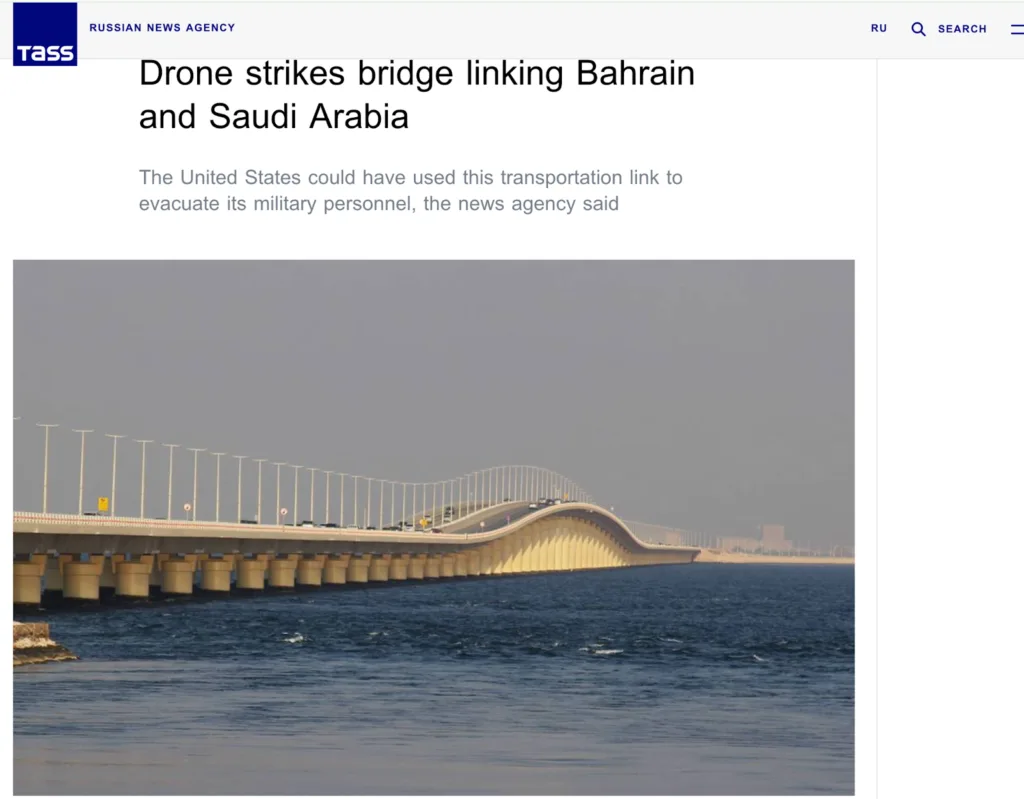 ബഹ്റൈൻ കടലിടുക്കിന് കുറുകെ സൗദി അറേബ്യയെയും ബഹ്റൈനെയും തമ്മിൽ ബന്ധിപ്പിച്ച് നിർമ്മിച്ചിരിക്കുന്ന 25 കിലോമീറ്റർ നീളമുള്ള പാലമാണ് ‘കിങ് ഫഹ്ദ് കോസ്വേ’. ഈ പാലം ആക്രമിക്കപ്പെട്ടതിനെ പറ്റി നടത്തിയ ഗൂഗിൾ സെർച്ച് ചെന്നത്തിയത് പ്രധാനമായും നാല് വാർത്ത റിപ്പോർട്ടുകളിലാണ്. ദ കാസ്പിയൻ പോസ്റ്റ് (The Caspian Post), ന്യൂസ്.അസ് (News.az), ടാസ് (TAZZ), എന്നീ മാധ്യമങ്ങൾ ഈ പാലത്തിൽ മാർച്ച് 3 ന് ഇറാൻ ഡ്രോൺ ആക്രമണം നടത്തിയതായി പറയുന്നു. ഇതിൽ ടാസ് റഷ്യൻ സർക്കാർ ഉടമസ്ഥതയിലുള്ള മാധ്യമമാണ്. റഷ്യ ഇറാനെതിരായുള്ള യുഎസ്-ഇസ്രയേൽ ആക്രമണത്തെ അപലപിച്ചിരുന്നു.