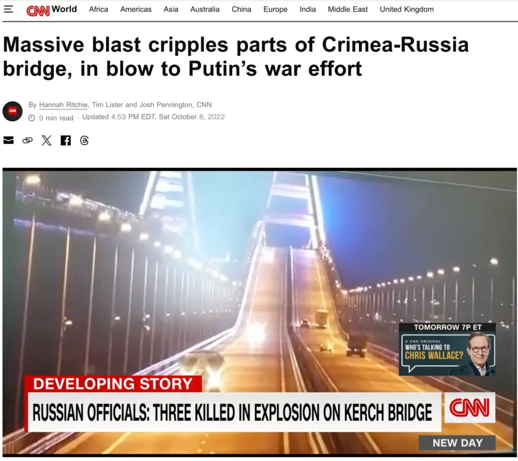 ചില പോസ്റ്റുകളിൽ ഡ്രോൺ ഉപയോഗിച്ചാണ് പാലം തകർത്തതെന്ന് പറയുമ്പോൾ മറ്റ് ചില പോസ്റ്റുകളിൽ മിസൈൽ ആക്രമണം ആണെന്നാണ് ആരോപണം. വസ്തുതകളിലെ ഈ കൃത്യതയില്ലായ്മ പരിശോധിക്കാൻ, വീഡിയോയുടെ സ്ക്രീൻഷോട്ട് ഉപയോഗിച്ച് ഗൂഗിൾ റിവേഴ്സ് സെർച്ച് ചെയ്ത ഞങ്ങൾ ചെന്നെത്തിയത് 2022 ഒക്ടോബർ 8 ലെ ‘സിഎൻഎൻ വേൾഡ്’ (CNN World) എന്ന അമേരിക്കൻ മാധ്യമത്തിന്റെ വാർത്തയിലാണ്.