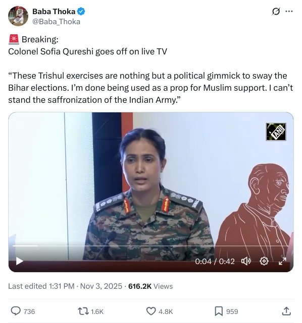 ഇന്ത്യയിലെ മുതിർന്ന സൈനിക ഓഫീസറായ കേണല് സോഫിയ ഖുറേഷിയുടെ ഒരു വൈറൽ വീഡിയോ ഇപ്പോൾ ചില എക്സ് അക്കൗണ്ടുകൾ വഴി പ്രചരിക്കുന്നുണ്ട്. ഇന്ത്യൻ കര – നാവിക – വ്യോമ സേനകൾ സംയുക്തമായി നടത്തുന്ന ‘ത്രിശൂൽ’ എന്ന സൈനിക അഭ്യാസം ബീഹാർ തെരഞ്ഞെടുപ്പിനെ മുന്നിൽക്കണ്ടുകൊണ്ടു നടത്തിയ തന്ത്രമാണ് എന്ന് ഓഫീസർ വീഡിയോയിൽ പറയുന്നതായാണ് കാണുന്നത്. പക്ഷെ പരിശോധനയിൽ വീഡിയോ എ ഐ നിർമ്മിതമാണെന്നു കണ്ടെത്തി. ഇന്ത്യൻ ആർമി കാവി വൽക്കരിക്കപ്പെട്ടതിന്റെ ഭാഗമായാണ് ത്രിശൂൽ എന്ന സൈനികാഭ്യാസം നടന്നതെന്ന് സോഫിയ ഖുറേഷി പറയുന്ന 42 സെക്കന്റ് ദൈർഘ്യമുള്ള വീഡിയോ നവംബർ മൂന്നിനാണ് എക്സ് അക്കൗണ്ട് വഴി പ്രചരിപ്പിക്കപ്പെട്ടത്. എൻ ഡി എ സഖ്യത്തിന്റെ ആവശ്യ പ്രകാരമായിരുന്നു ത്രിശൂൽ അഭ്യാസമെന്നും ബീഹാറിലെ തെരഞ്ഞെടുപ്പ് വിജയമായിരുന്നു ലക്ഷ്യമെന്നും വീഡിയോയിൽ സോഫിയ പറയുന്നതായി കാണുന്നുണ്ട്.