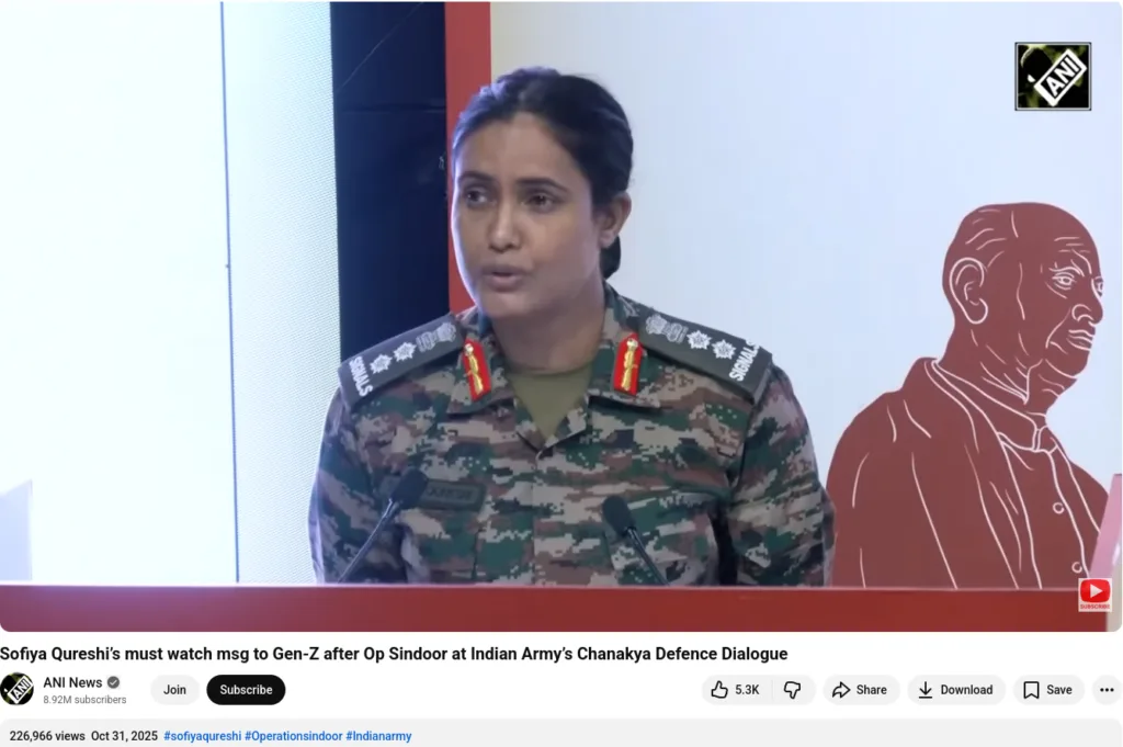 വസ്തുത പരിശോധിക്കുന്നതിനായി വീഡിയോ ഗൂഗിൾ റിവേഴ്സ് ഇമേജ് സേർച്ച് ചെയ്തു. അപ്പോൾ ഏഷ്യൻ ന്യൂസ് ഇന്റർനാഷനലിന്റെ (ANI) 2025 ഒക്ടോബർ 31 ന് അപ്ലോഡ് ചെയ്ത ഒരു യൂട്യൂബ് വീഡിയോയാണ് കണ്ടത്. ഇന്ത്യൻ ആർമിയും ന്യൂഡൽഹിയിലെ സെൻ്റർ ഫോർ ലാൻഡ് വാർഫെയർ സ്റ്റഡീസും സംയുക്തമായി (CLAWS) സംഘടിപ്പിച്ച ചാണക്യ ഡിഫൻസ് ഡയലോഗ് എന്ന അന്താരാഷ്ട്ര സെമിനാറിൽ ‘വീര യുവത: ഇന്ത്യയുടെ ദേശസുരക്ഷയ്ക്കായി യുവാക്കളെ ശാക്തീകരിക്കുക’ (Veer Yuva: Empowering Youth for India’s National Security) എന്ന വിഷയത്തിൽ സംസാരിക്കുകയായിരുന്നു സോഫിയ ഖുറേഷി.