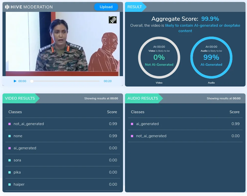 യൂണിവേഴ്സിറ്റി അറ്റ് ബഫല്ലോയിലെ (University at Buffalo – UB) മീഡിയ ഫോറൻസിക്സ് ലാബിന്റെ എ ഐ ടൂൾ ആയ DeepFake-O-Meter നെ ആശ്രയിച്ചു. വീഡിയോ എ ഐ നിർമ്മിതമായിരിക്കാനുള്ള സാധ്യത 99.9 ശതമാനമാണെന്നാണ് DeepFake-O-Meter പറയുന്നത്.