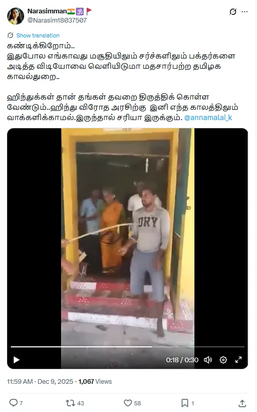 “വിശ്വാസികളെ തല്ലിച്ചതക്കുന്ന വീഡിയോ. ഹിന്ദുക്കൾ തങ്ങളുടെ തെറ്റുകൾ തിരുത്തണം, ഇനി ഒരിക്കലും ഒരു ഹിന്ദു വിരുദ്ധ സർക്കാരിന് വോട്ട് ചെയ്യരുത്” എന്നുള്ള അടിക്കുറിപ്പോടെ ഡിസംബർ ഒൻപതിനും ഇതേ വീഡിയോ എക്സിൽ പ്രചരിച്ചിരുന്നു. തമിഴ്നാട് ബിജെപി നേതാവ് അണ്ണാമലൈയെ ടാഗ് ചെയ്ത് കൊണ്ടാണ് പോസ്റ്റ് പ്രചരിപ്പിച്ചിട്ടുള്ളത്. അണ്ണാമലൈയുടെ ആരാധകൻ എന്നാണ് അക്കൗണ്ട് ഉപയോക്താവ് സ്വയം അവകാശപ്പെടുന്നത്. 1070 പേരാണ് ഡിസംബർ പതിനാറാം തിയതി വരെ വീഡിയോ എക്സിൽ കണ്ടത്.