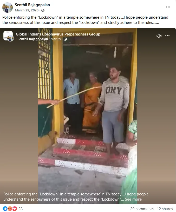 “തമിഴ്നാട്ടിലെ ഒരു ക്ഷേത്രത്തിലെ പോലീസ് നടപടി, പ്രശ്നത്തിൻ്റെ ഗൗരവം ആളുകൾ മനസ്സിലാക്കുകയും ലോക്ക് ഡൗൺ നിയന്ത്രണങ്ങൾ കർശനമായി പാലിക്കുകയും ചെയ്യുമെന്ന് ഞാൻ പ്രതീക്ഷിക്കുന്നു” എന്നാണ് പ്രചരിച്ച പോസ്റ്റിലെ കുറിപ്പ്.