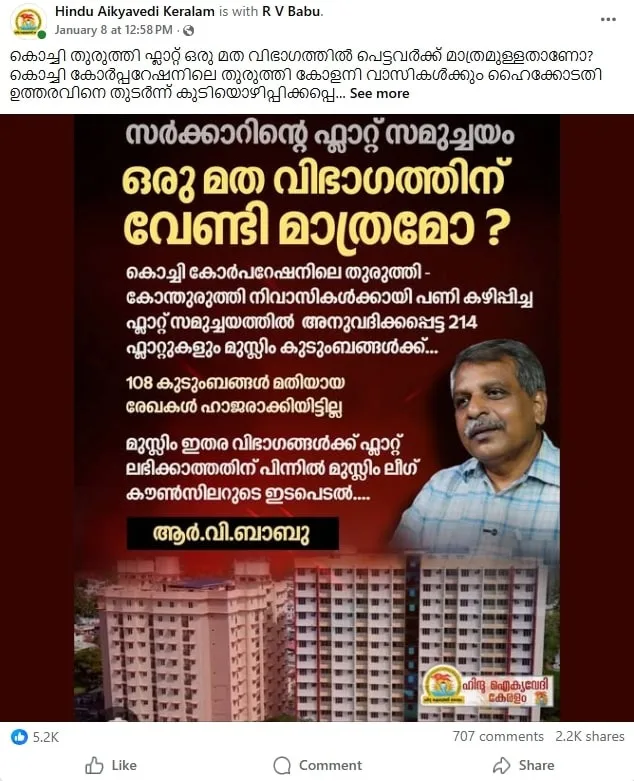 ഹിന്ദു ഐക്യവേദി സംസ്ഥാന പ്രസിഡൻ്റ് ആർ.വി. ബാബുവിൻ്റെ ചിത്രം സഹിതം പ്രചരിക്കുന്ന പോസ്റ്റുകളിൽ, ഈ ഫ്ലാറ്റ് സമുച്ചയത്തിലെ 214 ഫ്ളാറ്റുകളും ഒരു പ്രത്യേക മതവിഭാഗത്തിന് (മുസ്ലീങ്ങൾക്ക്) മാത്രമാണ് നൽകുന്നതെന്ന് ആരോപിക്കുന്നു. ഒരു ഭവന പദ്ധതിയെ വർഗീയ ധ്രുവീകരണത്തിന് ഉപയോഗിക്കുന്നതരത്തിൽ പ്രചരിപ്പിക്കുന്ന ഈ പോസ്റ്റുകളുടെ വസ്തുത ഞങ്ങൾ പരിശോധിച്ചു.