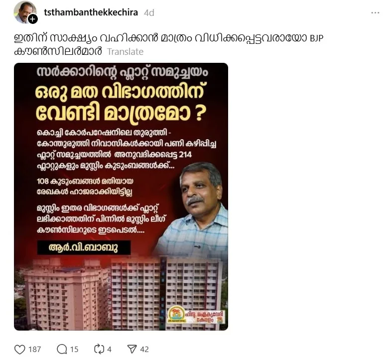 “സർക്കാരിൻ്റെ ഫ്ലാറ്റ് സമുച്ചയം ഒരു മത വിഭാഗത്തിന് വേണ്ടി മാത്രമോ? കൊച്ചി കോർപ്പറേഷനിലെ തുരുത്തി – കോന്തുരുത്തി നിവാസികൾക്കായി പണി കഴിപ്പിച്ച ഫ്ലാറ്റ് സമുച്ചയത്തിൽ അനുവദിക്കപ്പെട്ട 214 ഫ്ലാറ്റുകളും മുസ്ലീം കുടുംബങ്ങൾക്ക്” എന്നാണ് സോഷ്യൽ മീഡിയ പോസ്റ്റ് പറയുന്നത്. ഒരു ലക്ഷത്തിയിരുപതിനായിരത്തിലധികം ഫോളോവേഴ്സ് ഉള്ള ട്രൂ തിങ്കേഴ്സ് , ‘വികസിത കേരളം ഭാരതീയ ജനതാ പാർട്ടി’ പോലുള്ള ചില വലതുപക്ഷ സോഷ്യൽ മീഡിയ ഹാൻഡിലുകൾ വഴിയാണ് ഈ പോസ്റ്റ് വ്യാപകമായി പ്രചരിക്കുന്നത്.
