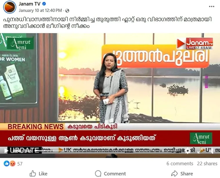 പുനരധിവാസത്തിനായി നിർമ്മിച്ച തുരുത്തി ഫ്ലാറ്റ് ഒരു വിഭാഗത്തിന് മാത്രമായി അനുവദിക്കാൻ ലീഗിൻ്റെ നീക്കം എന്ന് ജനം ടിവി റിപ്പോർട്ട് ചെയ്തിരുന്നു.