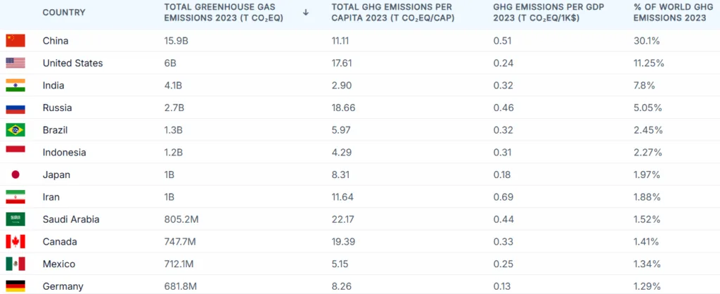 വേൾഡ് പോപ്പുലേഷൻ റിവ്യൂ കണക്കുകൾ പ്രകാരം, മൊത്തം ഹരിതഗൃഹ വാതക ഉൽപ്പാദനത്തിൽ അമേരിക്ക ആഗോളതലത്തിൽ രണ്ടാം സ്ഥാനത്താണുള്ളത്. ചൈനയാണ് ഒന്നാം സ്ഥാനത്ത്.