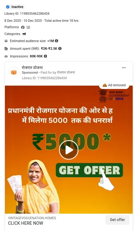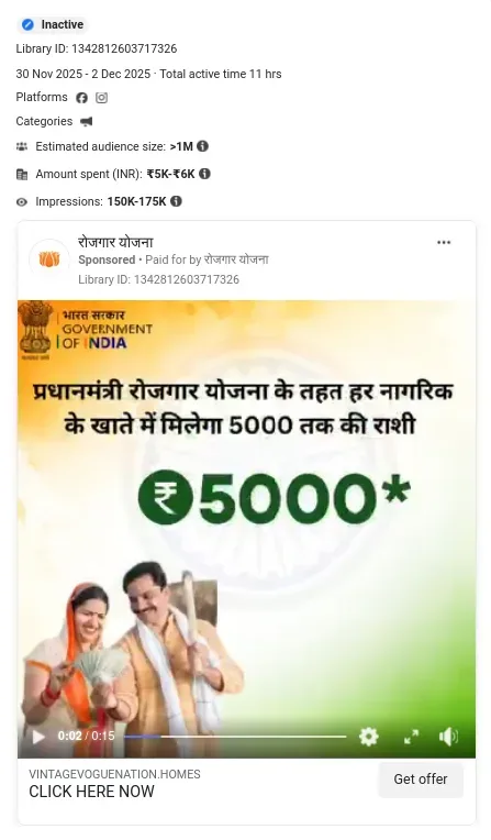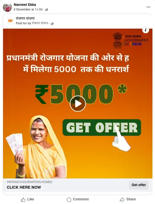 “പ്രധാനമന്ത്രിയുടെ തൊഴിൽ പദ്ധതിയിലൂടെ അയ്യായിരം രൂപ വരെ നിങ്ങൾക്ക് ഇപ്പോൾ ലഭിക്കും” എന്ന് ഹിന്ദിയിൽ എഴുതിയ പരസ്യ ചിത്രമാണ് ഡിസംബർ 12 നും 13 നുമായി ഫേസ്ബുക്കിൽ റീലായി പ്രചരിച്ചത് (ഇപ്പോൾ ഇത് നീക്കം ചെയ്തതായി കാണുന്നു). പോസ്റ്ററിൽ, കേന്ദ്ര സർക്കാർ മുദ്രയും കാണാം. “ലിങ്കിൽ ക്ലിക്ക് ചെയ്താൽ ആനുകൂല്യങ്ങൾ കൈപ്പറ്റാം” എന്നാണ് വീഡിയോയിൽ പറയുന്നത്.