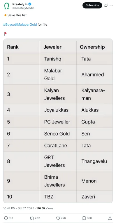 #BoycottMalabarGold എന്ന ക്യാമ്പയിനിന്റെയും മുഖ്യ പ്രചാരകർ ഇതേ അക്കൗണ്ട് ആയിരുന്നു. ഒക്ടോബർ 17ന് മുസ്ലിംകൾ അല്ലാത്ത ജ്വല്ലറി ഉടമകളുടെ ഒരു പട്ടിക ഇവർ പുറത്തു വിടുകയും എക്സ് ഉപയോക്താക്കളോട് മലബാർ ഗോൾഡ് ബഹിഷ്ക്കരിക്കാൻ ആഹ്വാനം ചെയ്യുകയും ചെയ്തു. 1,76,000ത്തിൽപരം ആളുകളാണ് പോസ്റ്റ് കണ്ടത്.