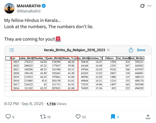 സെപ്റ്റംബർ 8ന്, @MahaRathii എന്ന അക്കൗണ്ടിൽ നിന്ന്, 2016-2023 കാലയളവിലെ കേരളത്തിലെ ഹിന്ദു-മുസ്ലിം ജനസംഖ്യയുടെ കണക്കുകൾ എന്ന് അവകാശപ്പെട്ടു കൊണ്ട് ഒരു പോസ്റ്റ് വന്നു. 1736ൽ കൂടുതൽ പേരാണ് ഈ പോസ്റ്റ് കണ്ടത്.