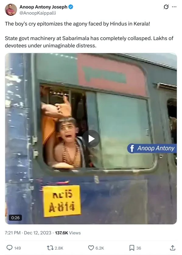 കേരളത്തിലെ ബി ജെ പി ജനറൽ സെക്രട്ടറി അനൂപ് ആന്റണി ജോസഫിന്റെ അക്കൗണ്ട് ഈ വിഭാഗത്തിൽ പ്രധാനപ്പെട്ടതാണ്. 2023 ഡിസംബർ 12ന്, തെറ്റിദ്ധാരണ പരത്തുന്ന ചില വർഗീയ പ്രചാരണങ്ങൾ അനൂപ് ആന്റണി എക്സിൽ നടത്തി. ‘ശബരിമല തീർത്ഥാടകരോടുള്ള സർക്കാരിന്റെ ക്രൂരത’യെന്ന തെറ്റായ അടിക്കുറിപ്പോടെ, ഏഷ്യാനെറ്റ് ന്യൂസിൽ വന്ന ഒരു വീഡിയോ ശകലം അനൂപ് ആന്റണി എക്സിൽ പോസ്റ്റ് ചെയ്യുകയായിരുന്നു. പോസ്റ്റിന് നിലവിൽ 1,37,600 കാഴ്ചക്കാരും 6200 ലൈക്കുകളുമുണ്ട്. 2800 പേർ പോസ്റ്റ് റീപോസ്റ്റ് ചെയ്തിട്ടുമുണ്ട്.