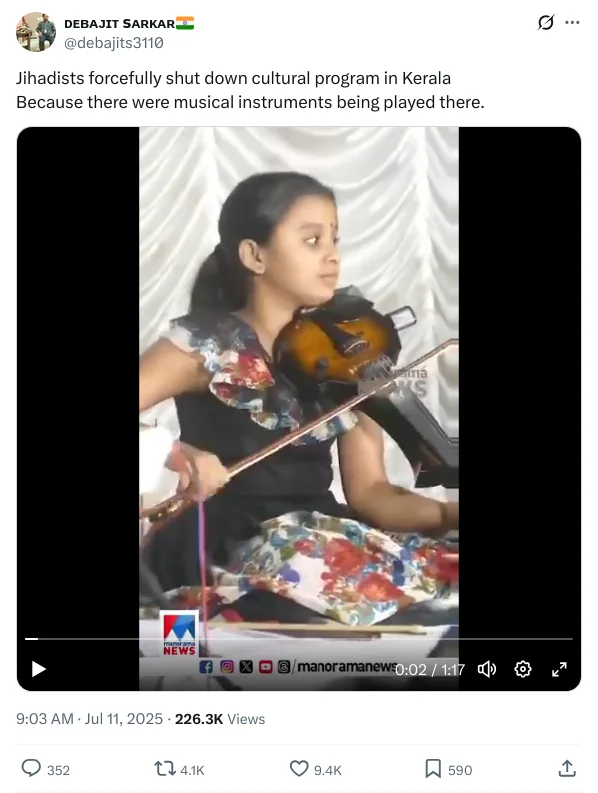 ആലപ്പുഴയിലെ ഒരു കുഞ്ഞു വയലിനിസ്റ്റിന്റെ പരിപാടിയും വലതു പക്ഷ ഹാൻഡിലുകൾക്ക് വെറുപ്പ് പടർത്താനുള്ള ഉപാധിയായിത്തീര്ന്നു. മുസ്ലിംകൾ നിർബന്ധിതമായി പ്രസ്തുത പരിപാടി നിർത്തിച്ചുവെന്ന ആരോപണത്തോടെ 2025 ജൂലൈയിൽ സമൂഹ മാധ്യമങ്ങളിൽ ഒരുപാട് പോസ്റ്റുകൾ വന്നു.