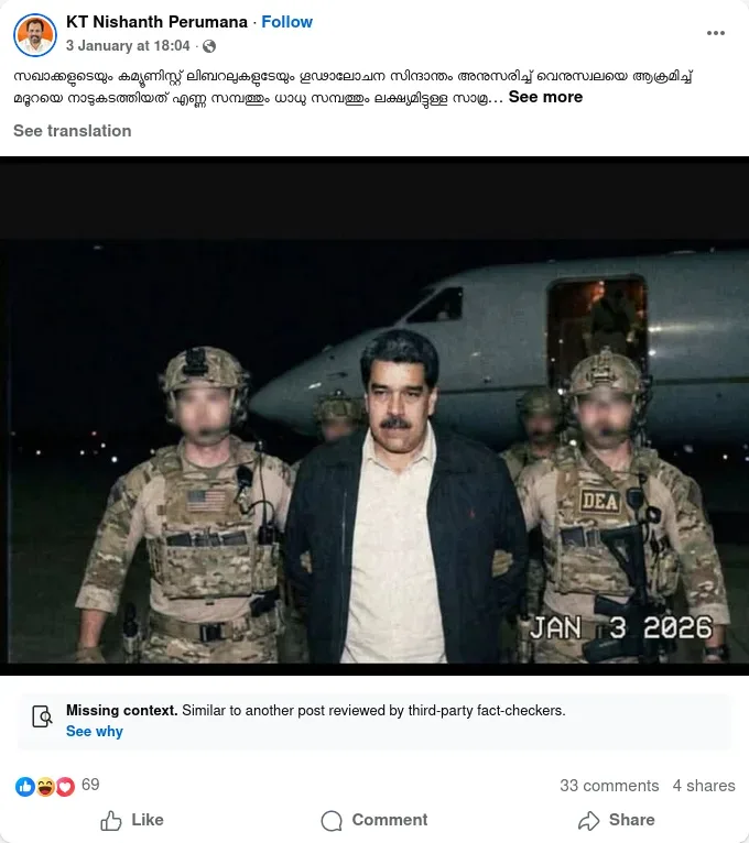 കയ്യിൽ വിലങ്ങണിഞ്ഞിരിക്കുന്ന മഡുറോയുടെ മറ്റൊരു ചിത്രം, ഒരു എക്സ് പ്രൊഫൈലിലൂടെ പങ്കുവയ്ക്കപ്പെട്ടിരുന്നു. “അമേരിക്ക ബന്ദിയാക്കിയ മഡുറോയുടെ ആദ്യ ഫോട്ടോ വൈറ്റ് ഹൗസ് പുറത്തുവിട്ടു” എന്നാണ് പോസ്റ്റിലെ ക്യാപ്ഷൻ. ‘യുഎൻഐ ടിവി മുൻ തമിഴ്നാട് ബ്യൂറോ ചീഫും രാഷ്ട്രീയ ഗവേഷകനുമായ സുരേഷ് കുമാർ’ എന്നാണ് എക്സ് അക്കൗണ്ട് ബയോയിലെ വിവരം. എന്നാൽ, പോസ്റ്റിലെ ഈ ചിത്രം മോർഫ് ചെയ്തതാണ്.