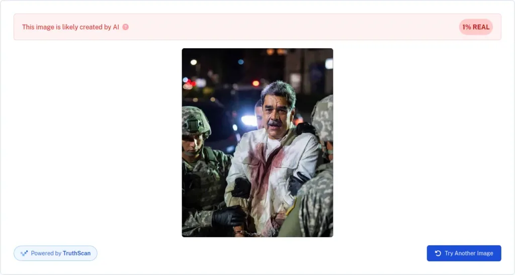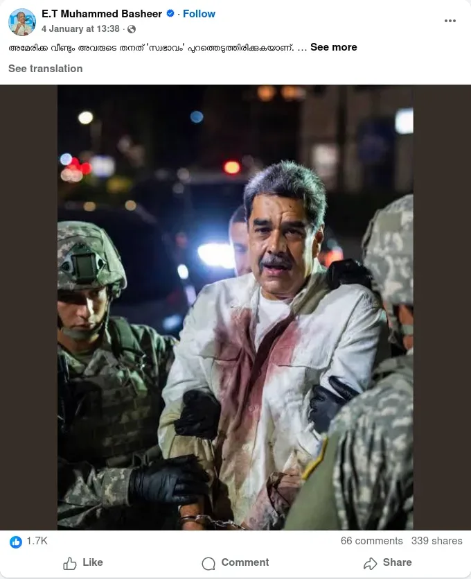 സൈനിക നടപടിയെ അപലപിച്ചുകൊണ്ടുള്ള ചില സോഷ്യൽ മീഡിയ പോസ്റ്റുകളിൽ, മറ്റൊരു എ ഐ ജനറേറ്റഡ് ചിത്രം കൂടി പങ്കുവയ്ക്കപ്പെട്ടിരുന്നു. കയ്യിൽ വിലങ്ങണിഞ്ഞു നിൽക്കുന്ന നിക്കോളാസിൻ്റെ ചിത്രമാണത്, ധരിച്ചിരിക്കുന്ന വസ്ത്രത്തിൽ രക്തക്കറ പുരണ്ടിരിക്കുന്നു. മുസ്ലിം ലീഗ് നേതാവും എം പിയുമായ ഇ ടി മുഹമ്മദ് ബഷീർ ഈ ചിത്രം ഷെയർ ചെയ്തിരുന്നു. 1,34000 ഫോളോവേഴ്സ് ആണ് ഈ അക്കൗണ്ടിനുള്ളത്. അക്കൗണ്ടിലെ ഏതാണ്ട് എല്ലാ പോസ്റ്റുകൾക്കും ആയിരത്തിലധികം ലൈക്കും ഷെയറും ലഭിക്കുന്നുണ്ട്. യു എസ് നടപടിയെ വിമർശിച്ചുകൊണ്ടുള്ള പോസ്റ്റ്, ജനുവരി അഞ്ചാം തീയതി വരെ മുന്നൂറിലധികം പേർ ഷെയർ ചെയ്തതായി കണ്ടു. എന്നാൽ, ഒരാൾ പോലും ചിത്രത്തിൻ്റെ വിശ്വാസ്യതയെ ചോദ്യം ചെയ്തതായി കാണുന്നില്ല. എല്ലാവരും അമേരിക്കയുടെ നടപടിക്കെതിരെ പ്രതികരിക്കുക മാത്രമാണ് ചെയ്തിട്ടുള്ളത്.