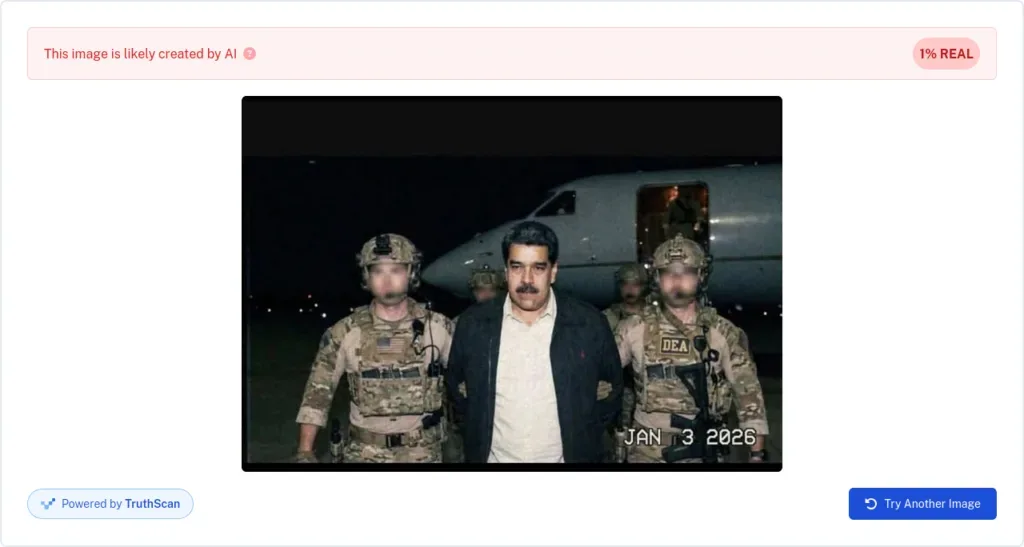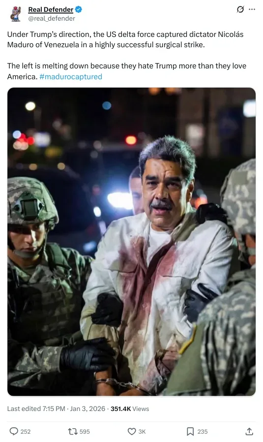 ‘റിയൽ ഡിഫൻഡർ’ എന്ന് പേരുള്ള ഒരു എക്സ് അക്കൗണ്ട് വഴിയാണ് ഈ ചിത്രം വ്യാപകമായി പ്രചരിപ്പിക്കപ്പെട്ടത്. “ട്രംപിന്റെ നിർദ്ദേശപ്രകാരം, യുഎസ് ഡെൽറ്റ ഫോഴ്സ് വെനിസ്വേലയിലെ ഏകാധിപതി നിക്കോളാസ് മഡുറോയെ വളരെ വിജയകരമായ ഒരു സർജിക്കൽ സ്ട്രൈക്കിലൂടെ പിടികൂടി” എന്ന അടിക്കുറിപ്പോടെ ജനുവരി മൂന്നിനാണ് ഇയാൾ ചിത്രം പങ്കുവച്ചത്. #madurocaptured എന്ന ഹാഷ്ടാഗ് പോസ്റ്റിൽ ഉപയോഗിച്ചിരിക്കുന്നു. ജനുവരി അഞ്ച് വരെ, ഈ പോസ്റ്റ് മൂന്ന് ലക്ഷത്തിൽ കൂടുതൽ ആളുകൾ കണ്ടു. അതായത് രണ്ട് ദിവസം കൊണ്ടുതന്നെ, പോസ്റ്റ് വ്യാപകമായി പ്രചരിച്ചിട്ടുണ്ട്. ഈ പോസ്റ്റിന് കീഴിലുള്ള കമൻ്റ് സെക്ഷനിൽ, ആളുകൾ ചിത്രം എ ഐ നിർമ്മിതമാണോയെന്ന സംശയമുന്നയിക്കുന്നതായി കാണാം. മറ്റൊരു അക്കൗണ്ടിലൂടെ പ്രചരിക്കുന്ന നിക്കോളാസിൻ്റെ ഇതേ ഫോട്ടോയിൽ, വസ്ത്രത്തിൽ രക്തക്കറയില്ലെന്ന സംശയമാണ് ഒരാൾ ചൂണ്ടിക്കാട്ടിയത്.